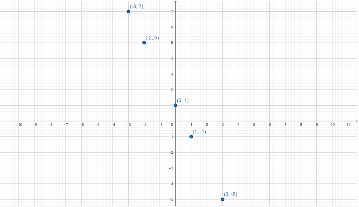 A1. Representa los siguientes puntos en el plano cartesianos: \(\left(3,-5\right)\), \(\left(1,-1\right)\), \(\left(0,1\right)\), \(\left(-2,5\right)\) y \(\left(-3,7\right)\). ¿Siguen un patrón especial esos puntos? Descríbelo.