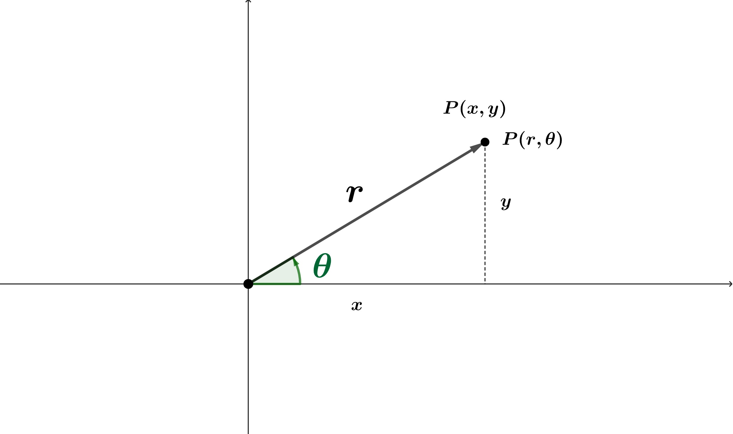 En este sistema de localización, podemos definir el punto con dos datos: la distancia al origen de coordenadas (radio \(r\)) y el ángulo giro respecto a un semieje (ángulo de giro \(\theta\)). En la figura siguiente podemos ver en un solo gráfico ambos sistemas: cartesiano y polar.