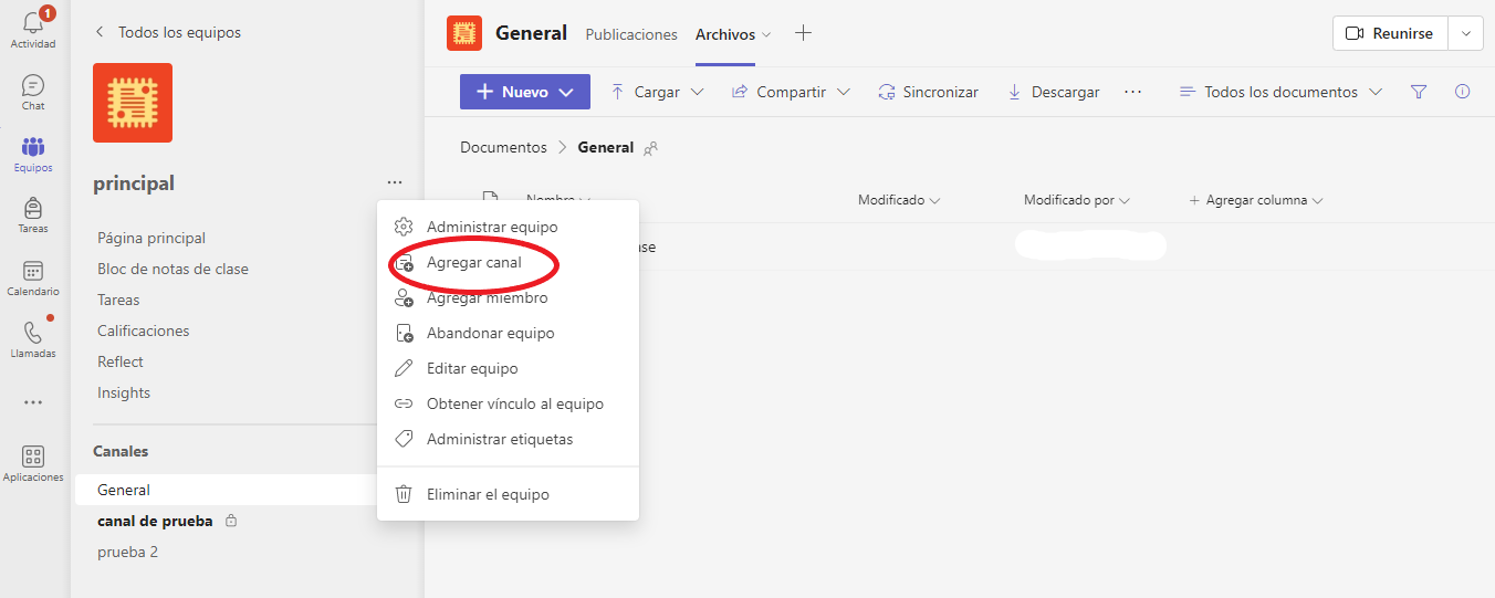 Para crear un canal debemos seleccionar Más opciones (en los tres puntos que aparecen junto al nombre del canal (en este caso, “Principal”)) y entre las opciones que aparecen, seleccionamos “Agregar Canal”.