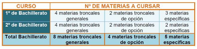 Entre los dos cursos del bachillerato, debes cursar los siguientes tipos de materias: