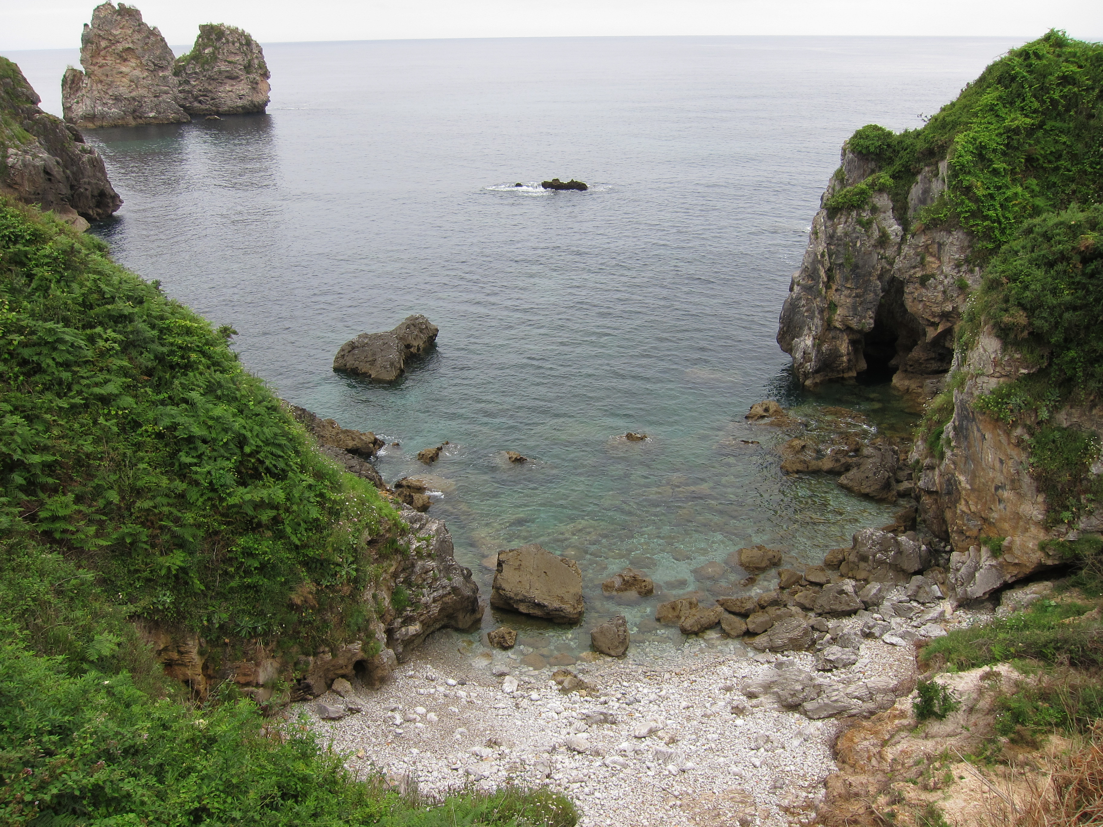 Imagen de una cala escarpada en la costa cantábrica. Se aprecian rocas en el mar al fondo y una playa rocosa en primer plano.