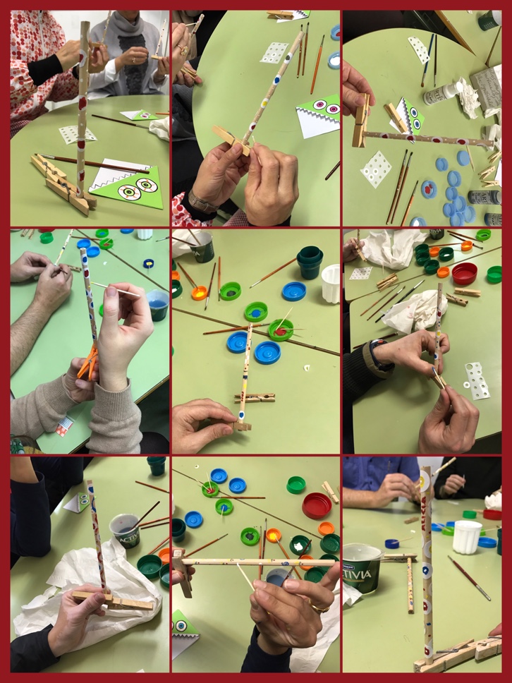 Consiste en la decoración de lápices con pintura acrílica. Se reparten los lapiceros y las arandelas de papel, y mediante pincel y palillos, y ayudados por pinzas se van decorando libremente los lapiceros.