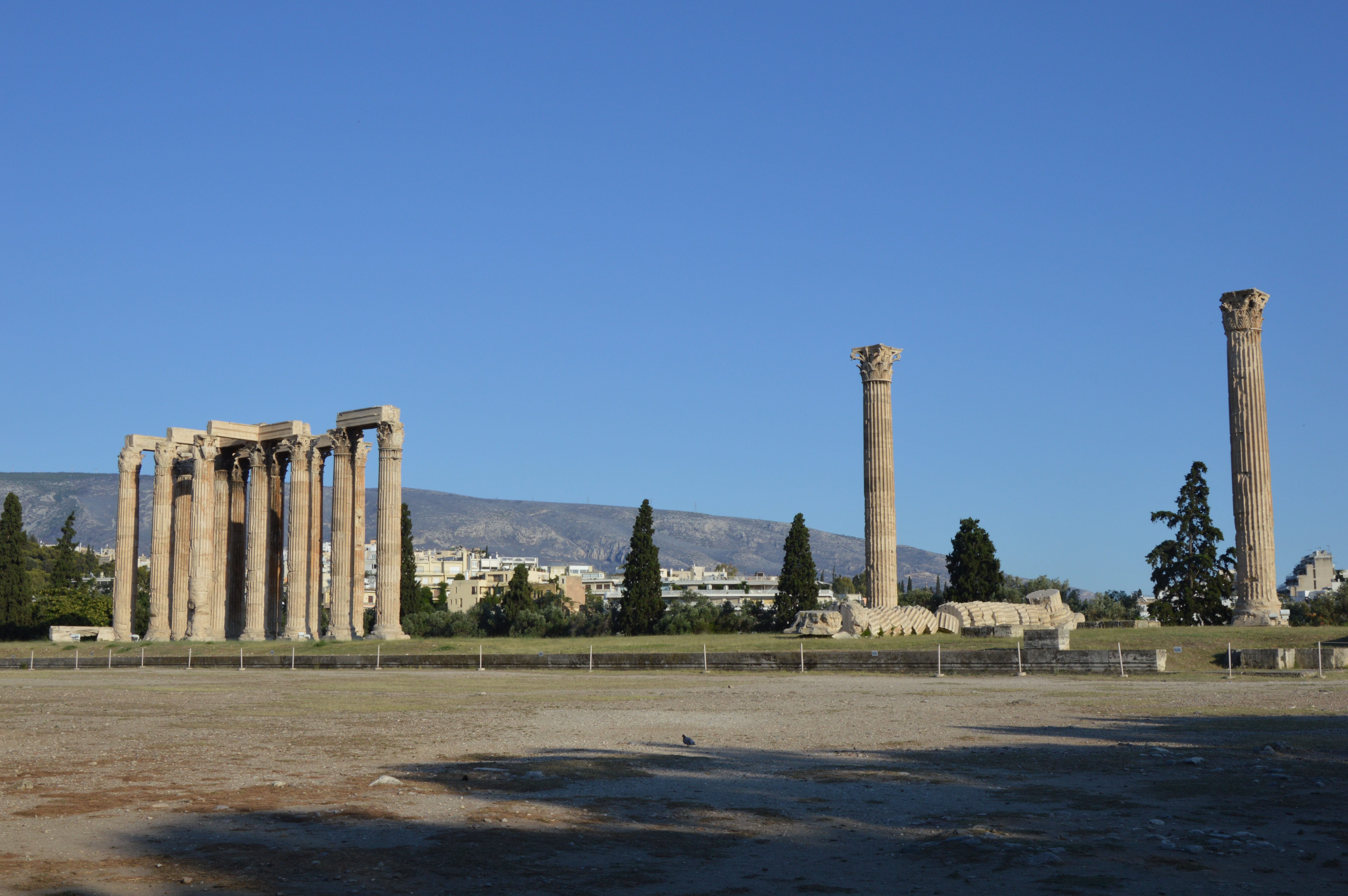 Restos del templo dedicado a Zeus Olímpico en Atenas que data del s. II a. C. Realizado en mármol pentélico representa una de las obras más grandiosas de la época helenística griega. Hoy solo se conservan 15 columnas de las 104 que tenía en origen, de orden corintio y con una altura de 15m.