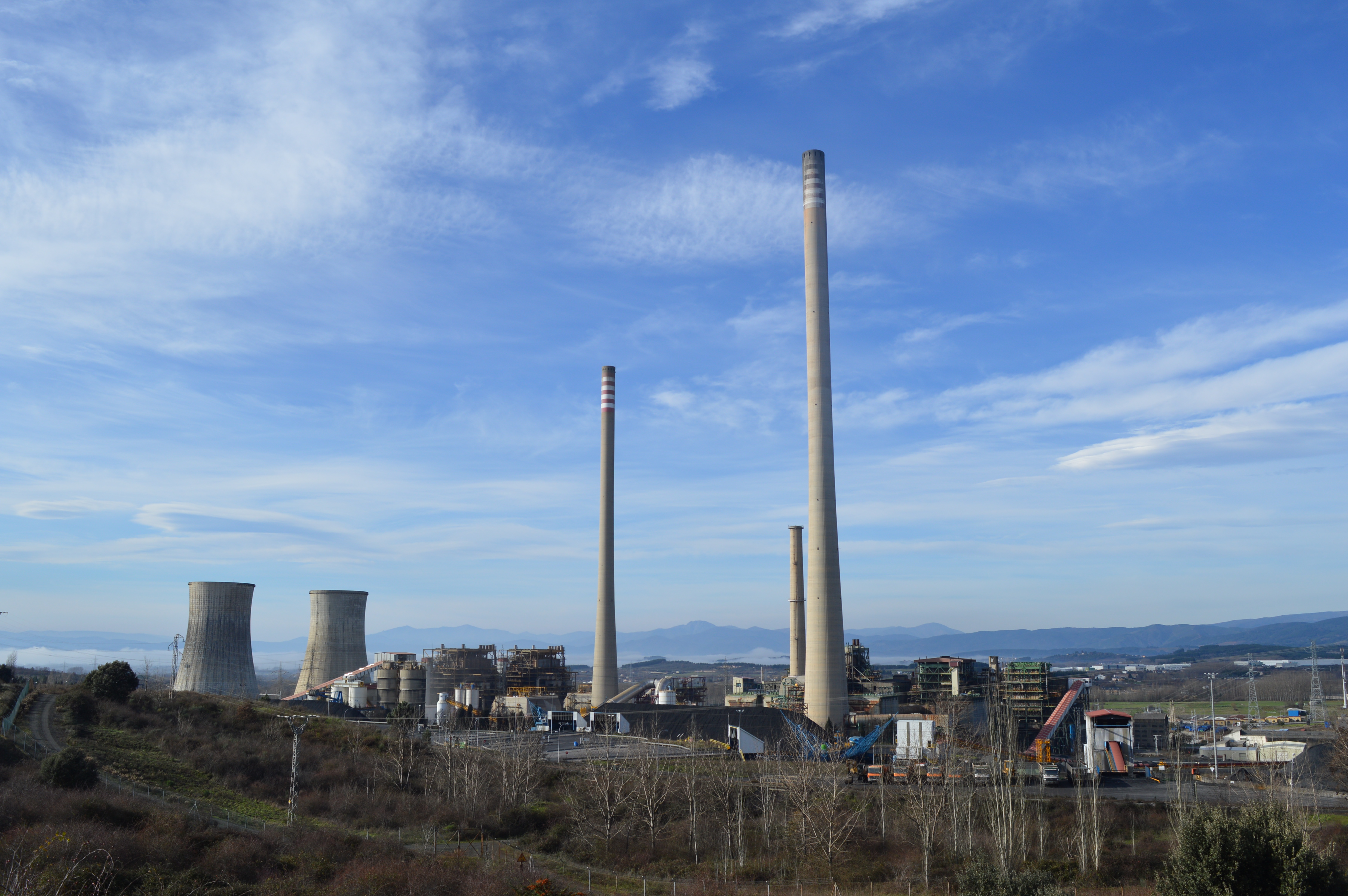 Central termoeléctrica ubicada en el municipio de Cubillos del Sil, en la comarca del Bierzo, León, cuyo sistema de funcionamiento se basa en un sistema termodinámico convencional, por el que se libera energía en forma de calor a través de la combustión de combustibles fósiles, fundamentalmente carbón. Esta central, propiedad de empresa eléctrica Endesa, sustituyó a la antigua central ubicada en Ponferrada, llamada Compostilla I. En la foto se aprecian las tres chimeneas por las que salen los gases de combustión, que son las torres más esbeltas y altas. Además, se ven las otras dos torres de refrigeración , más anchas y bajas.