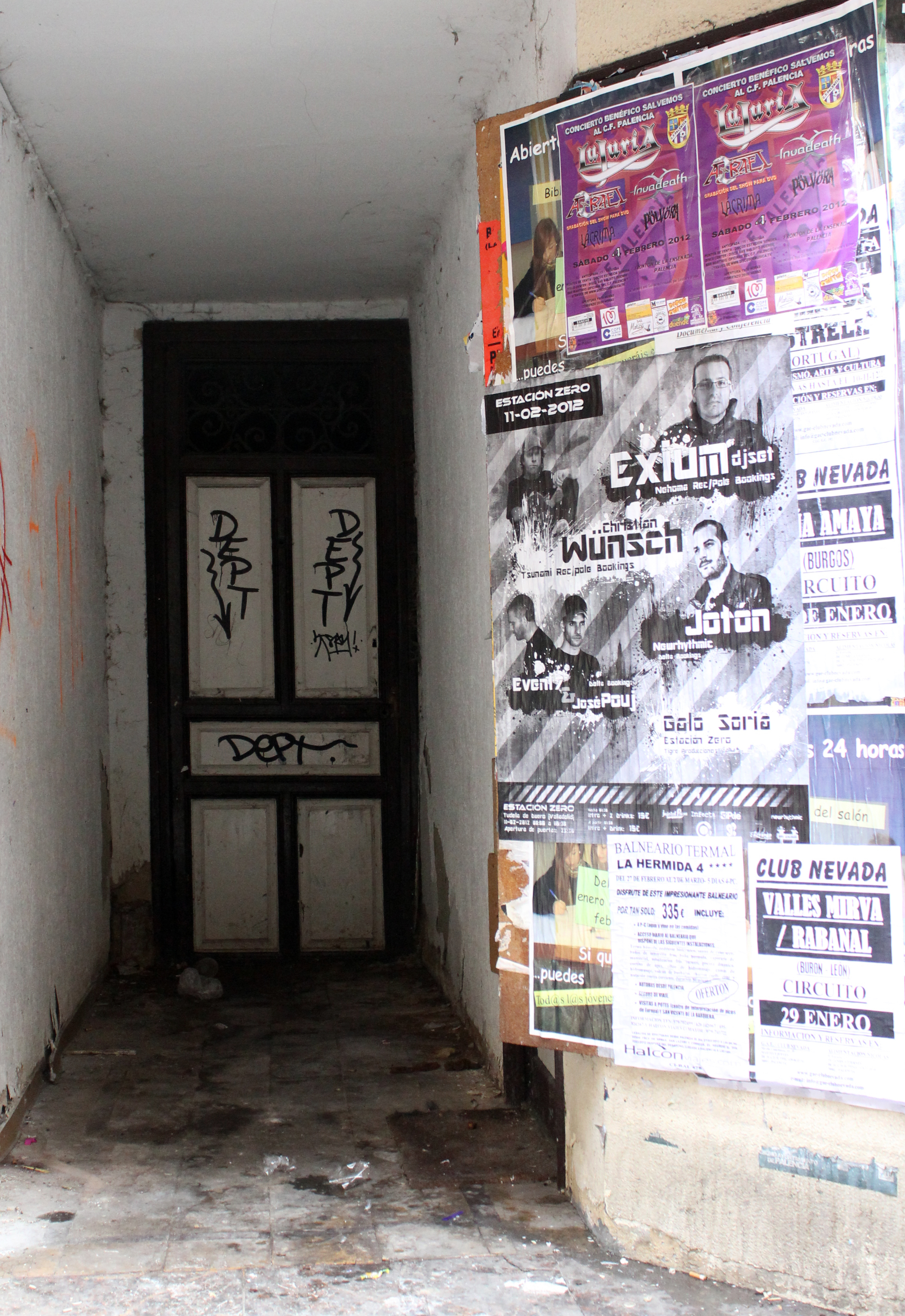 Local cerrado y abandonado con graffiti y carteles.