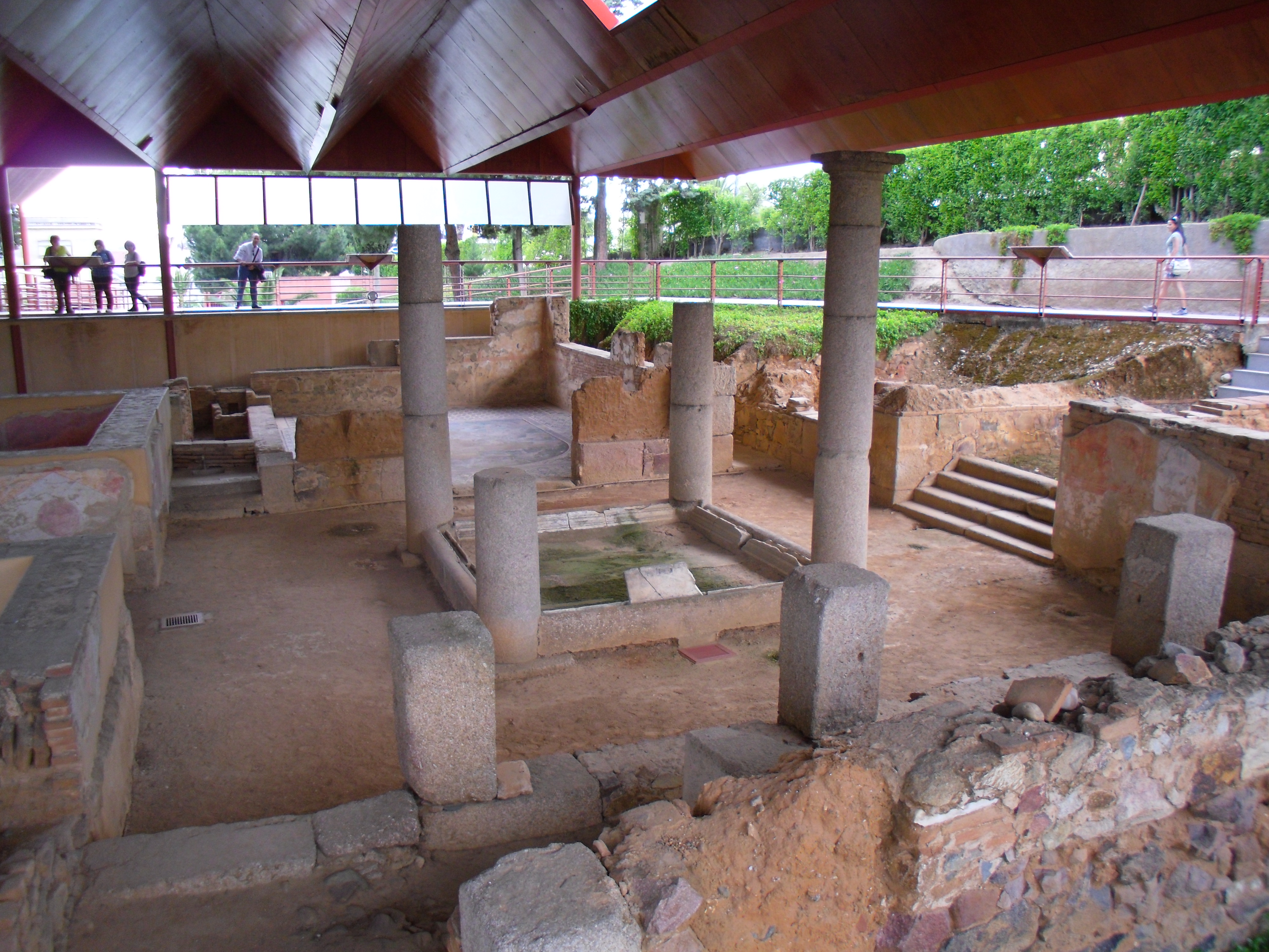 Restos del atrio principal, o primer atrio de una domus (casa) romana en Mérida, llamada domus del Mitreo por encontrarse cerca de los restos de un santuario a Mitra. Domus señorial con tres patios en torno a los que se ubicaban el resto de habitaciones. En el centro del patio, rodeado por columnas, se puede apreciar el impluvium, que servía para recoger el agua de la lluvia caída a través del compluvium. A este patio se accedía a través del vestíbulo o fauces