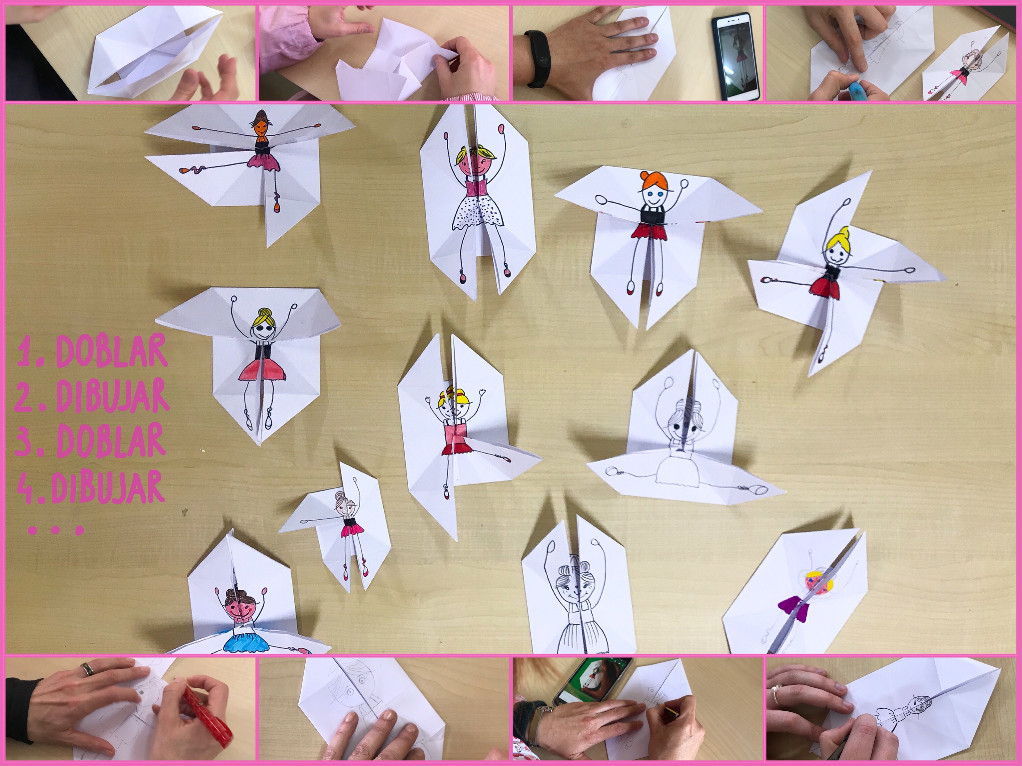Elaboración de bailarinas de papel. Partimos de un folio y lo transformamos en un cuadrado. Hacemos unos cuantos dobleces para conseguir una figura a partir de la cual comenzamos a dibujar la bailarina a lápiz. Una vez hecho esto, doblamos una parte hacia otro lado y volvemos a completar el dibujo haciéndolo coincidir con las partes que no han desaparecido, así hasta cuatro veces. Finalizado el proyecto, lo pintamos y lo repasamos a rotulador. Ahora ya podemos jugar con la bailarina cambiando su posición.