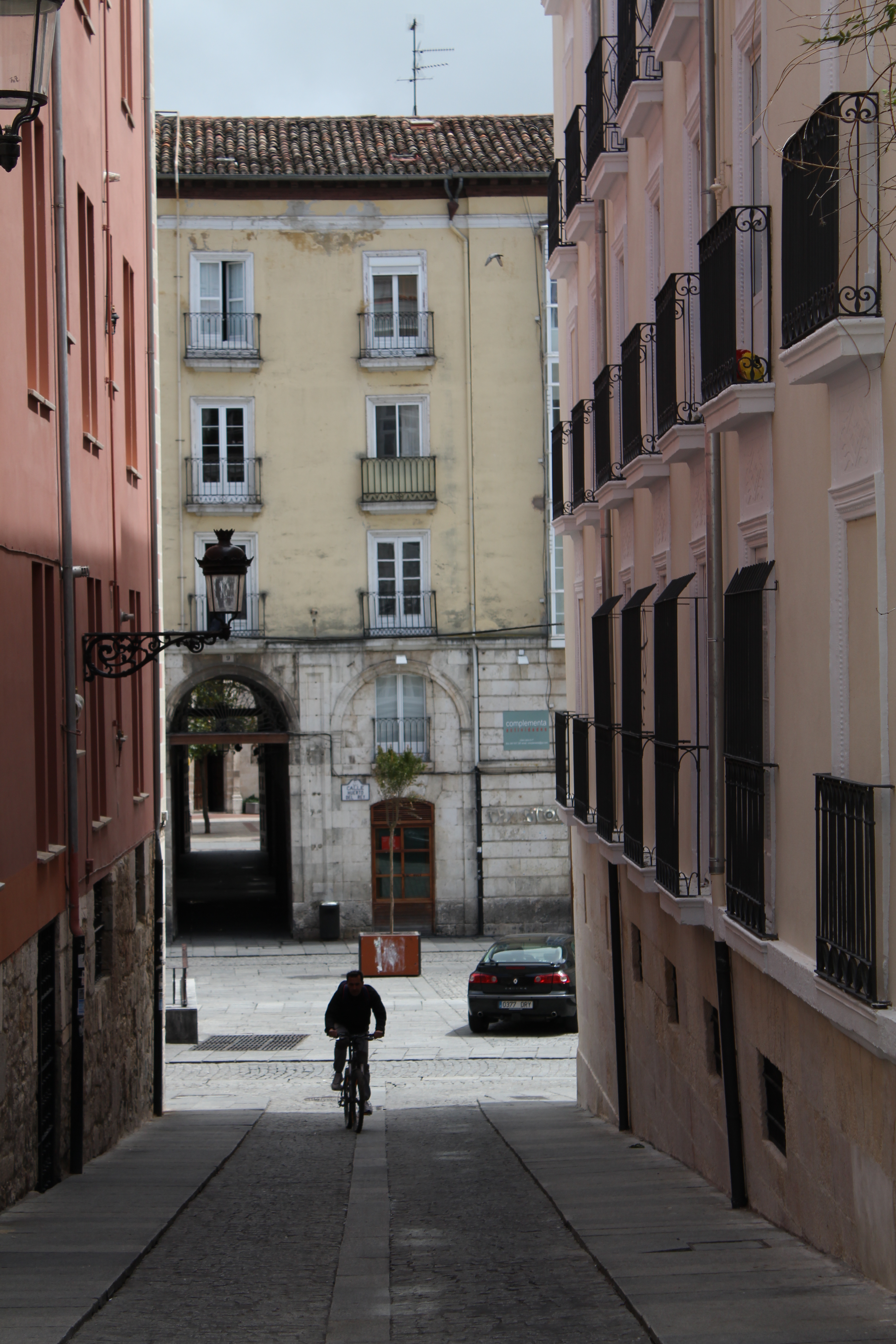 Ciclista en una cuesta hacia arriba entre calles y edificios.