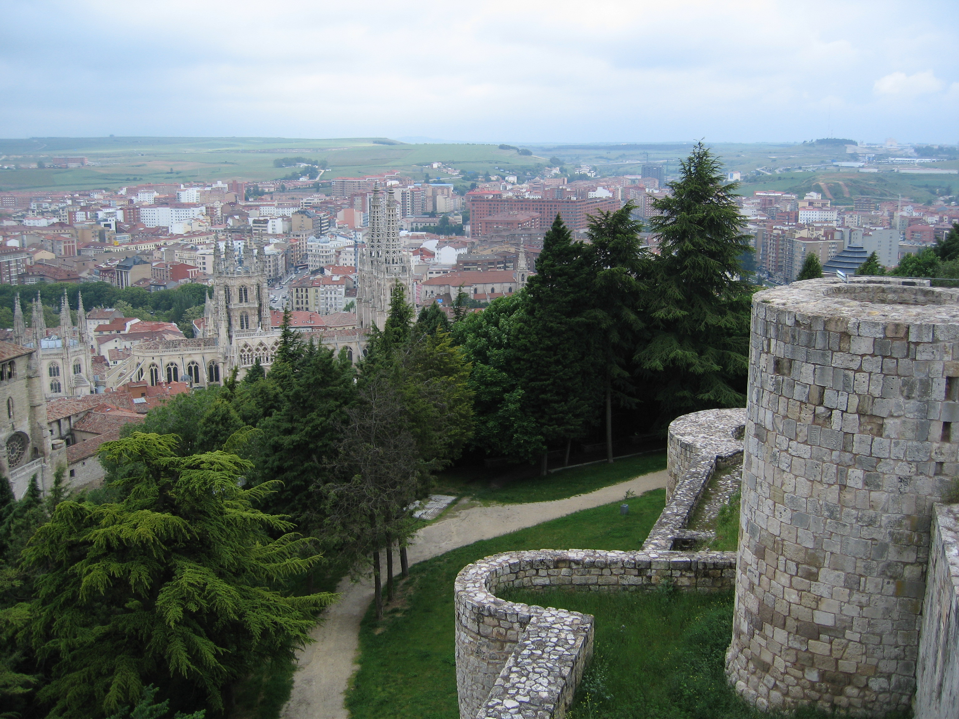 Imagen de la Catedral de Burgos y de la zona centro de la ciudad desde la altura de las ruinas del Castillo. En primer plano se ven los restos de la muralla restaurados con diferentes perímetros.