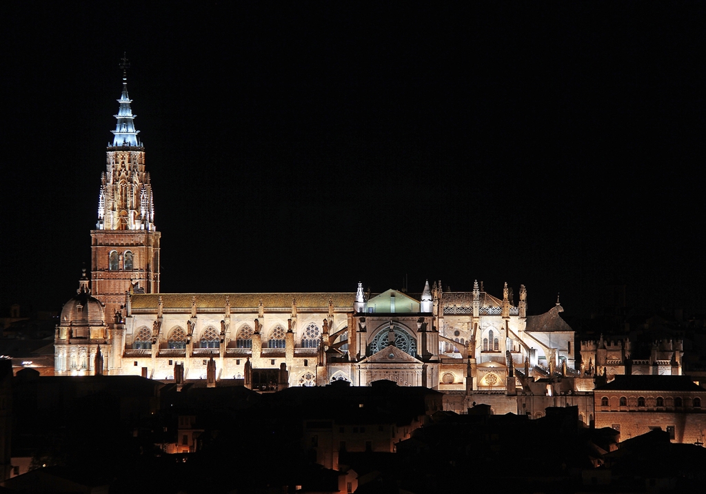 Vista general nocturna e iluminada de la catedral de Toledo.