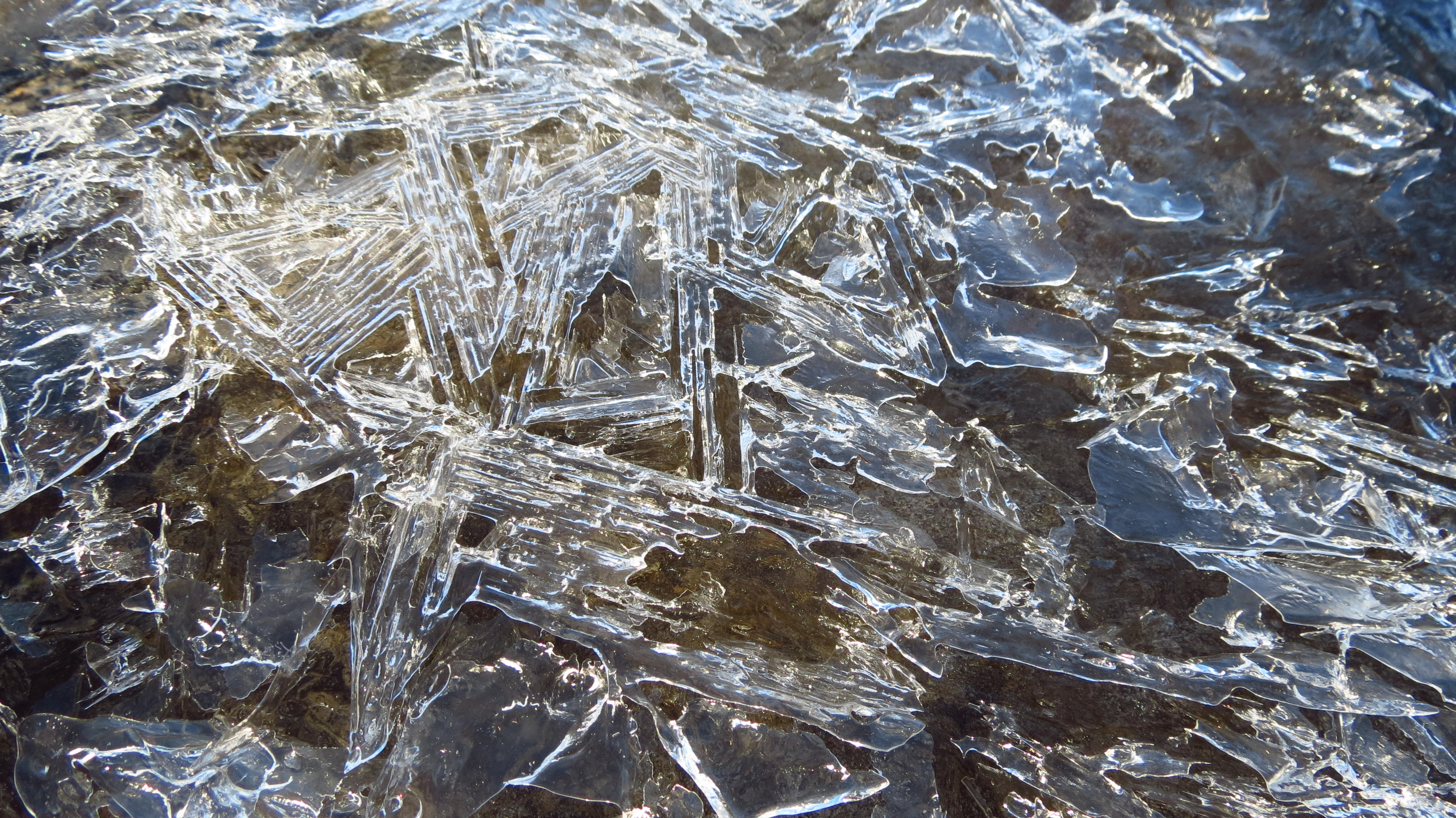 Entramado geométrico de hielo formado sobre la superficie del agua al ir derritiéndose.