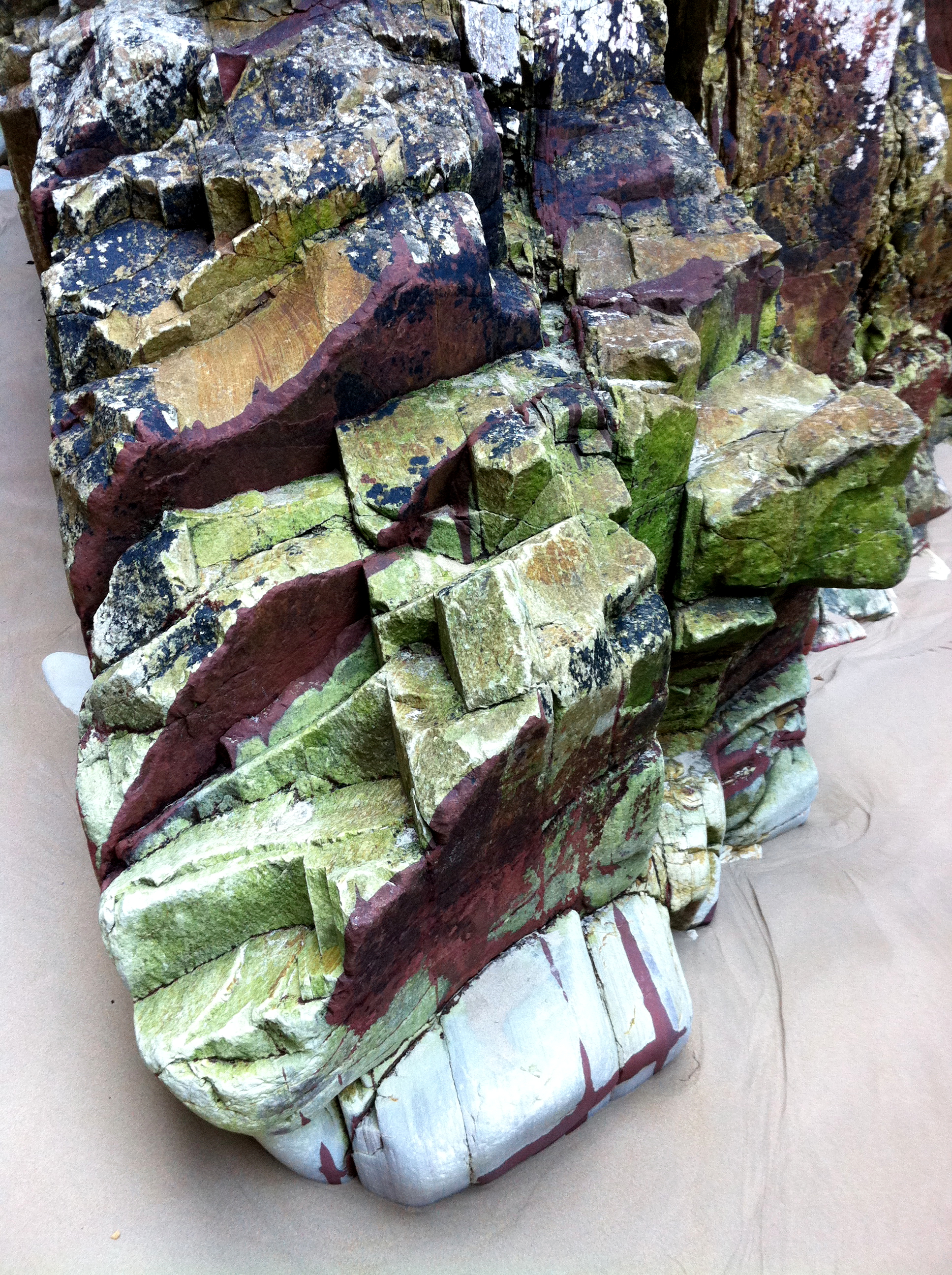 Pigmentos naturales sobre las piedras, en la playa. Playa de La Franca, Asturias (España)