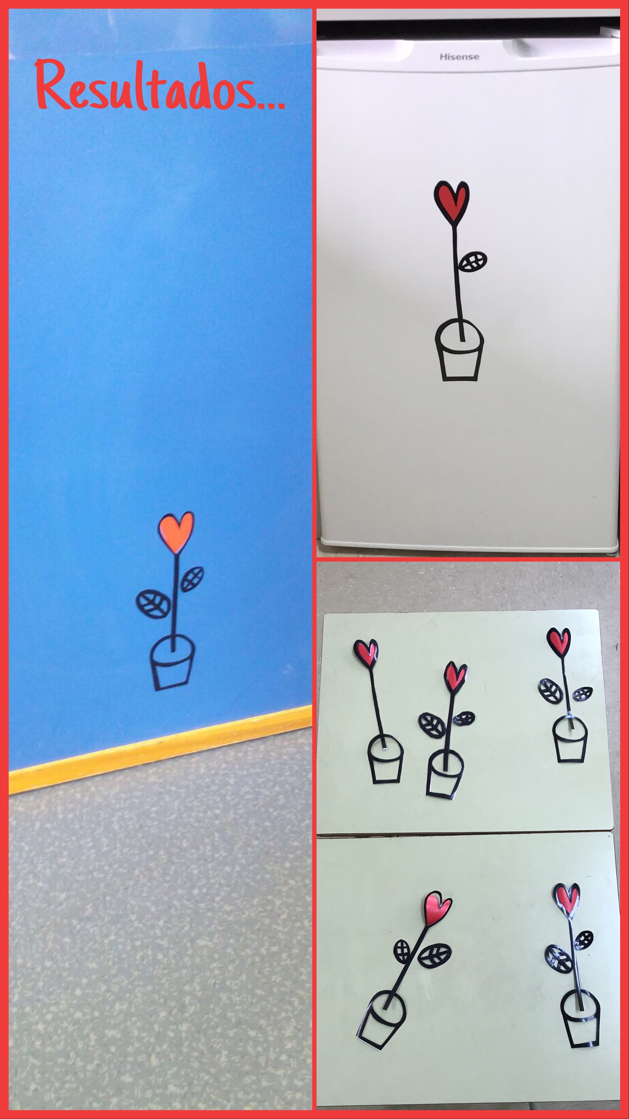 Decorar la clase con aironfix. Vamos a elaborar un modelo fácil para aprender a manejarlo y a partir de ahí se puede realizar cualquier tipo de diseño utilizando unas buenas tijeras. Tomando como base un patrón, hemos dibujado una maceta, una flor con forma de corazón en color negro y un corazón en rojo. Se pega el patrón por detrás del aironfix, se recorta y solo hay que pegarlo en la superficie que queramos decorar, quitando el papel de la pegatina muy despacito a la vez que vamos pegando el diseño. Para diseños en los que haya letras, hay que tener en cuenta que al dibujarlas por la parte de atrás, hay que hacerlas al revés. Se muestra imagen del resultado final.