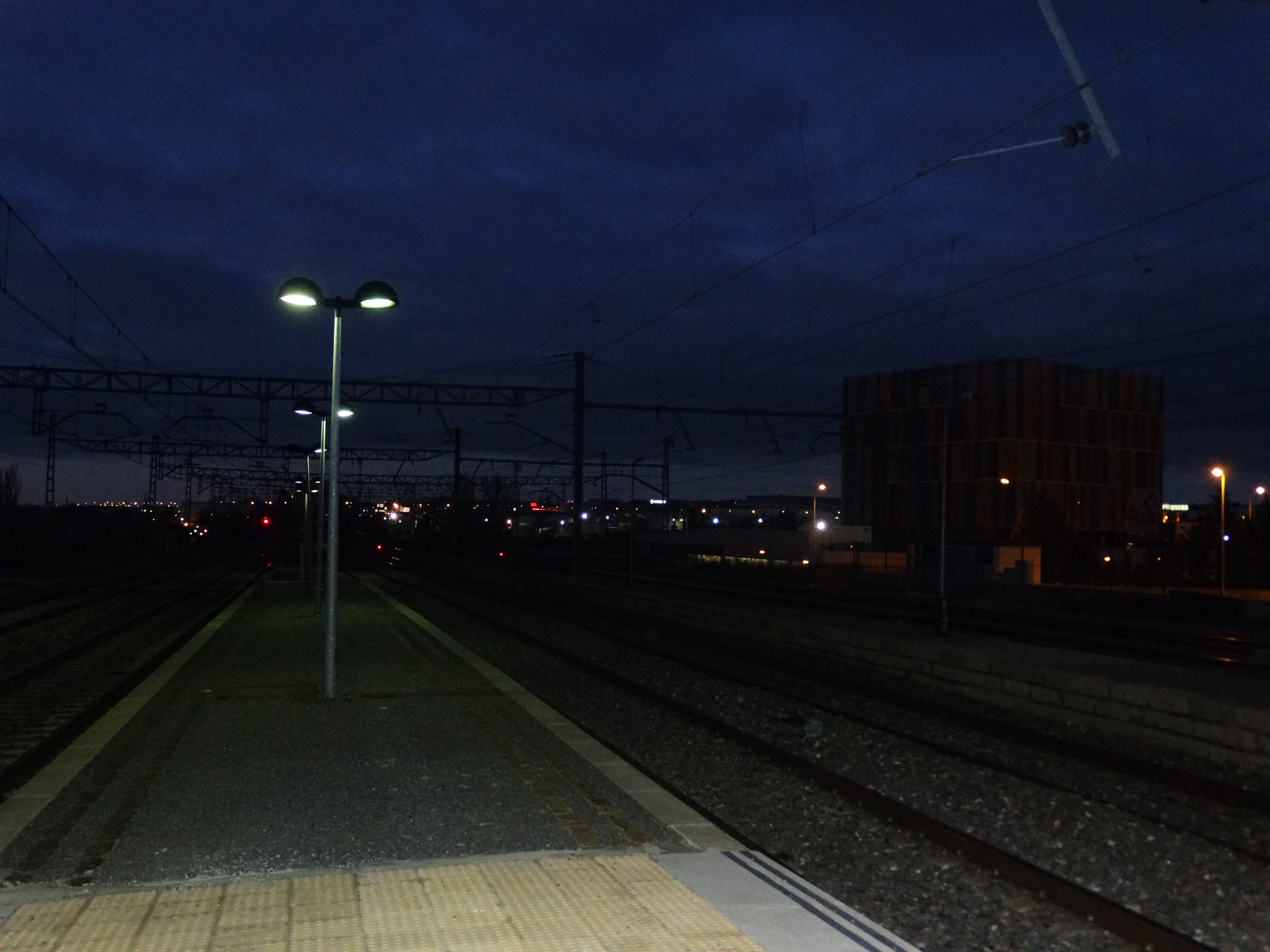 Cableado eléctrico en las cercanías de la estación de trenes de Ávila; estación de autobuses, al fondo.
