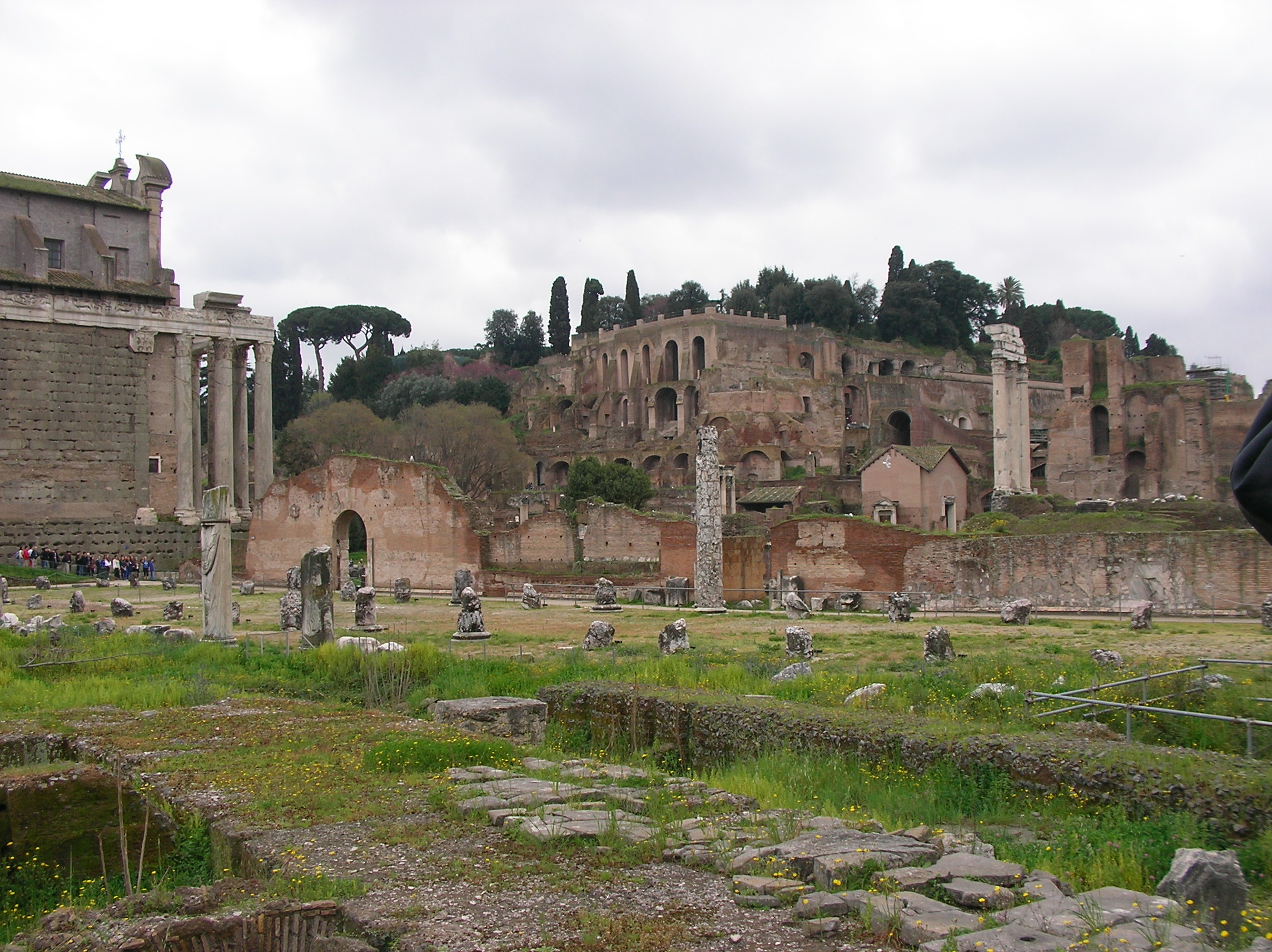 Restos del Foro de Roma, construido en la época de César y ampliado por sucesivos emperadores. Era el centro de la vida política y administrativa de la ciudad así como religiosa. En él se ubicaban numerosos edificios con distintas finalidades, como la basílica (centro de administración de justicia) o el tabulario (sede donde se guardaban archivos y documentos oficiales).