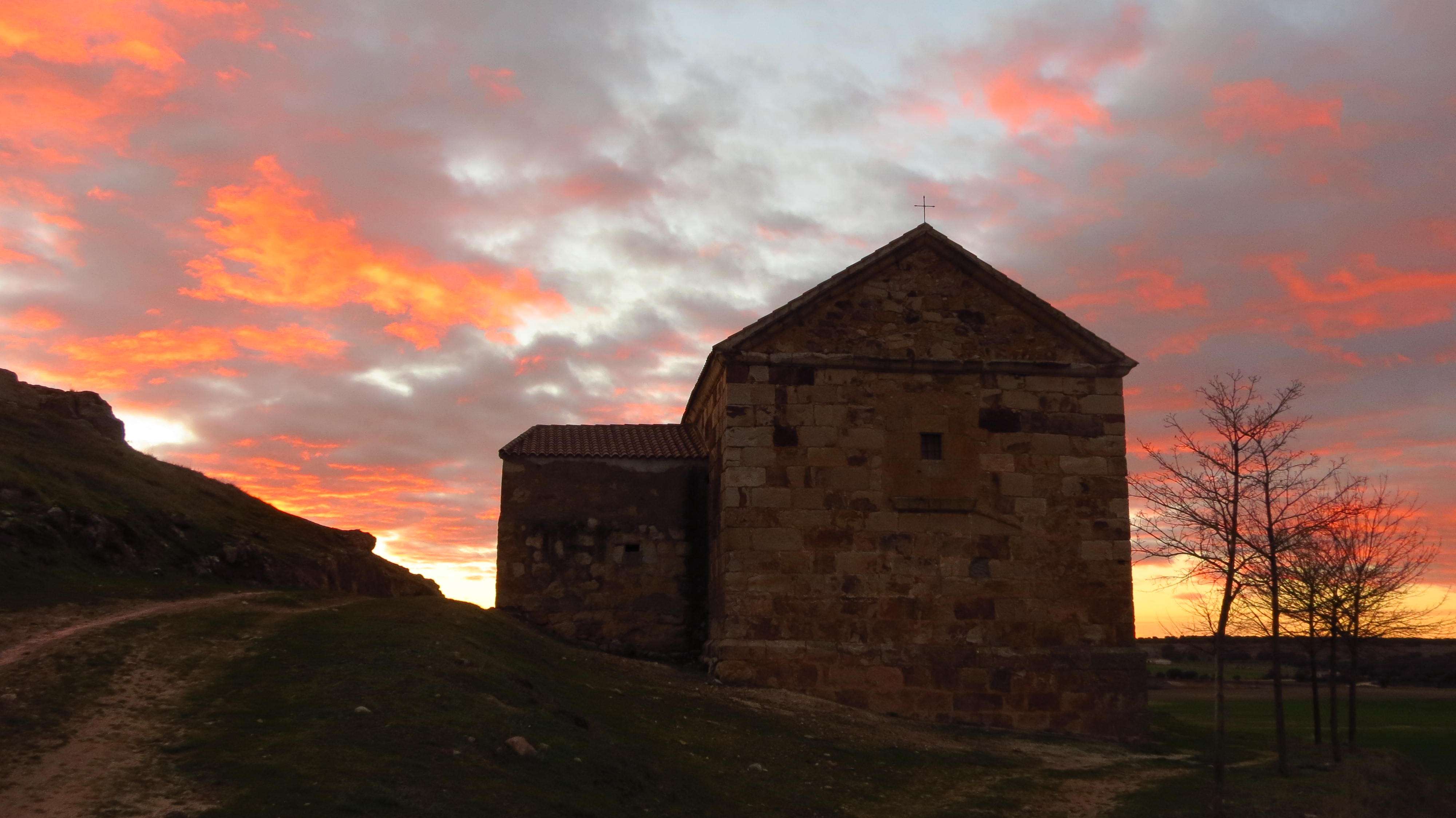 Fotografía de una ermita con los colores peculiares de las nubes al atardecer.
