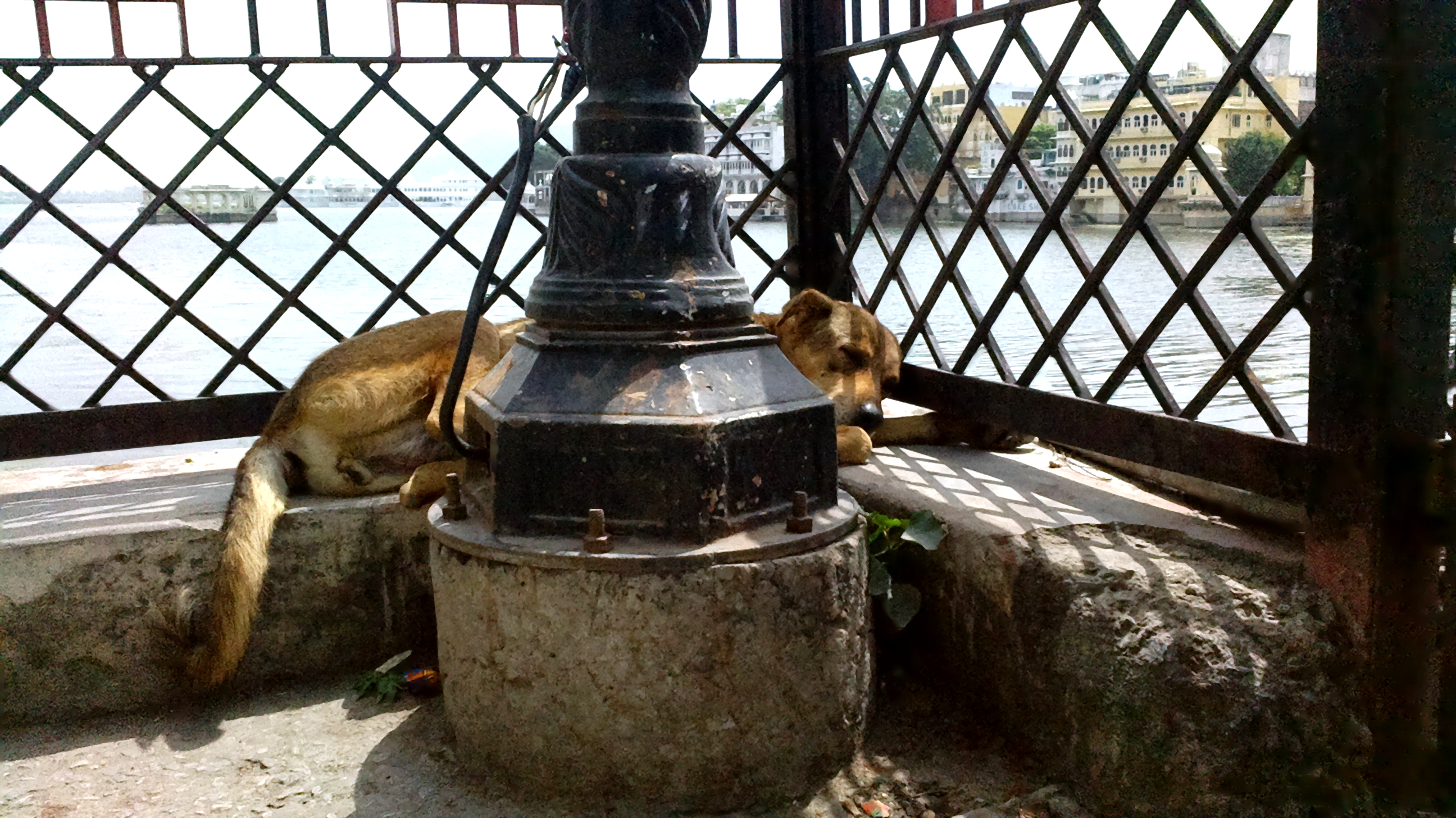 En medio del bullicio del puente por el que cruzaban miles de motos sin cesar y los curiosos que miraban la escena, este perro callejero, ausente al mundo, dirfutaba de su siesta. Al fondo la ciudad de Udaipur.