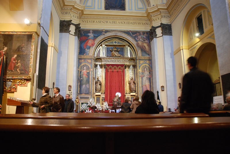 Sede de la célebre cofradía vallisoletana de de Nuestra Señora de las Angustias. A fines del siglo XVI dicha cofradía se traslada a la iglesia actual, frente al Palacio del Almirante, sobre el que se levantó en el siglo XIX el Teatro Calderón. La mayoría de miembros de la cofradíaeran ricos mercaderes, que solían realizar grandes donaciones. Sánchez de Aranzamendi dona la generosa cifra de 60.000 ducados para la construcción de la nueva iglesia, en la que pide ser enterrado en su interior en una sepultura sencilla. El arquitecto Juan de Nates proyecta una fachada inspirada en la Catedral y en modelos italianos. El cuerpo bajo es un arco de triunfo con gran puerta para los pasos. En el segundo está el balcón para los miembros de la cofradia. En 1710 se inaugura la capilla de la Virgen de las Angustias, tallada por Juan de Juni.