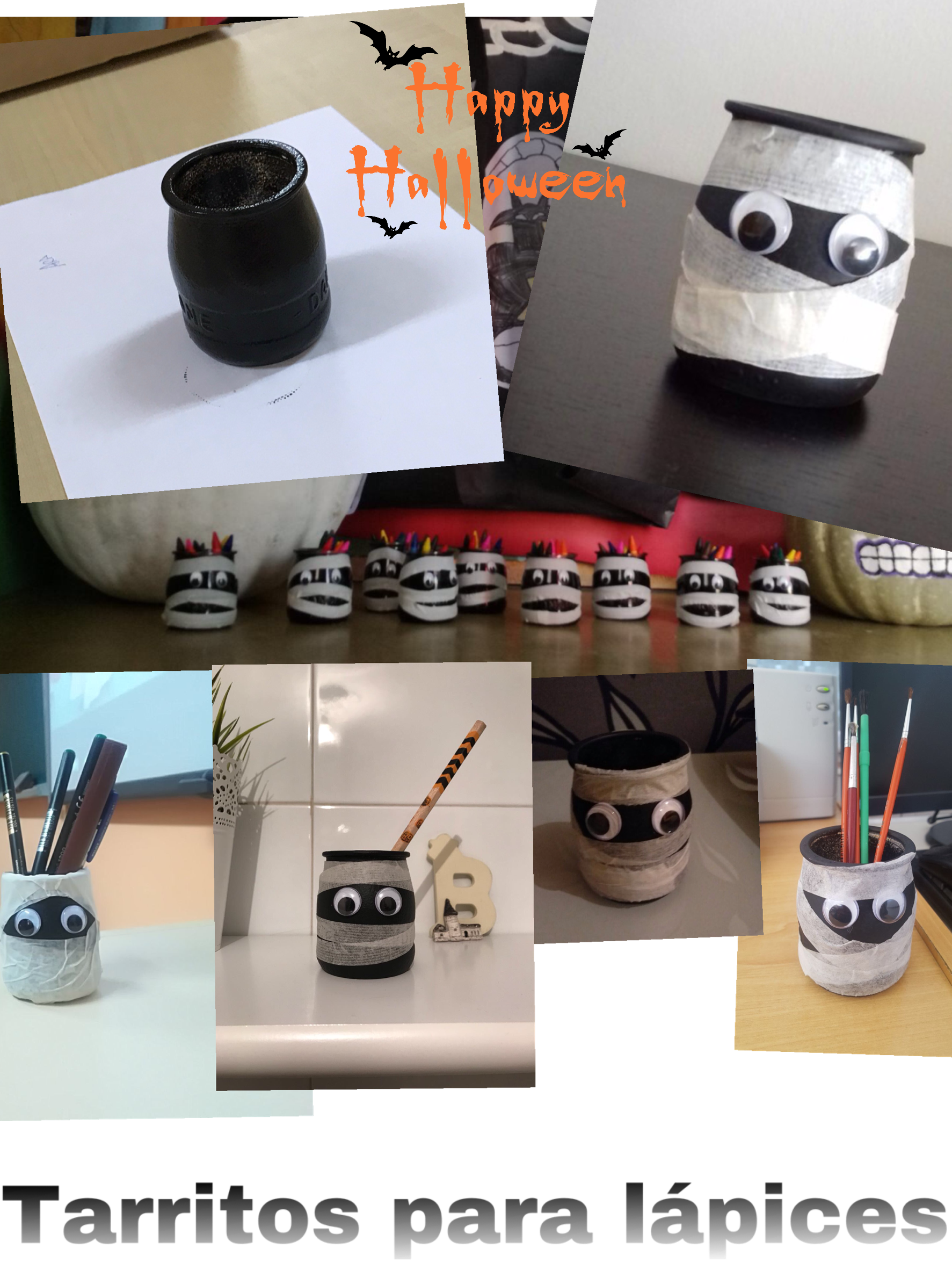 Se han realizado unos portalápices con apariencia de momia, con pintura, ojos y esparadrapo.