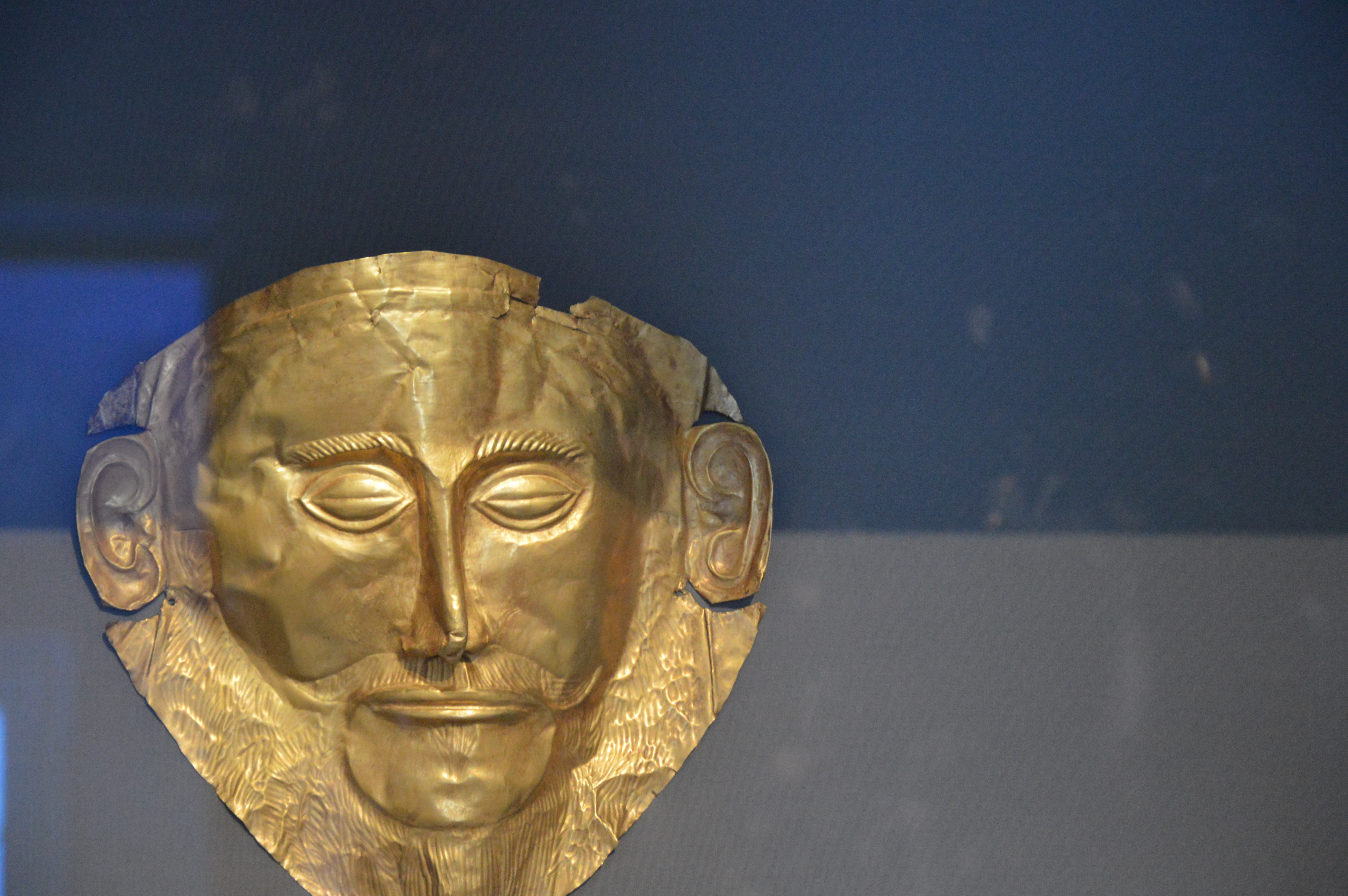 Máscara funeraria de oro de época micénica (1500 ¿ 1550 a.C.), hallada por el arqueólogo Heinrich Schliemann en una tumba de Micenas. Realizada en oro, su descubridor la identificó como la máscara de Agamenón aunque a posteriori se demostró que no era así.