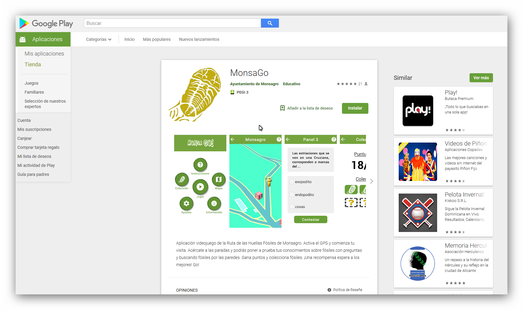 Videojuego presentado como aplicación móvil disponible en play store y desarrollado por Anna Chesnais y profesorado de la Facultad de Ciencias de la USAL en colaboración con la diputación provincial y el ayuntamiento de Monsagro.Permite un mejor conocimiento de los fósiles de Monsagro de forma divertida. Disponible en : https://play.google.com/store/apps/details?id=com.AnnieChesnais.MonsaGO