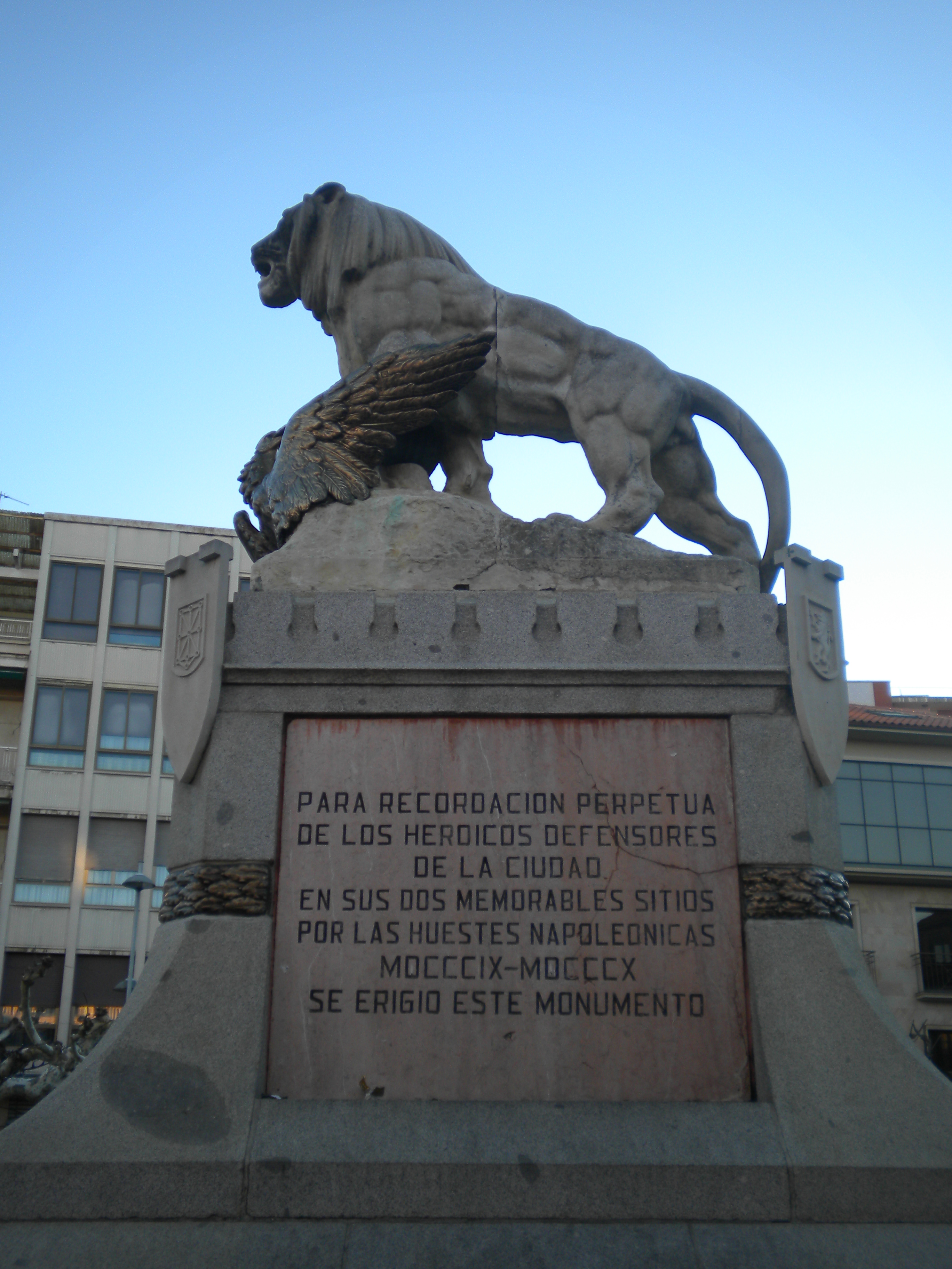 Parte lateral del monumento conmemorativo a los sitios o asedios realizados por el ejército francés con el fin de conquistar la ciudad de Astorga en los años 1810 y 1812, durante la Guerra de la Independencia. El autor es el escultor Enrique Marín Higuero, la obra se realizó en 1910, con motivo del centenario del primer sitio de Astorga (1810) y se localiza en el centro de la plaza de Santocildes (Astorga). Se observa una inscripción alusiva al tema del monumento y, en la parte superior, un león (España), abatiendo con sus garras a un águila (ejército francés napoleónico)