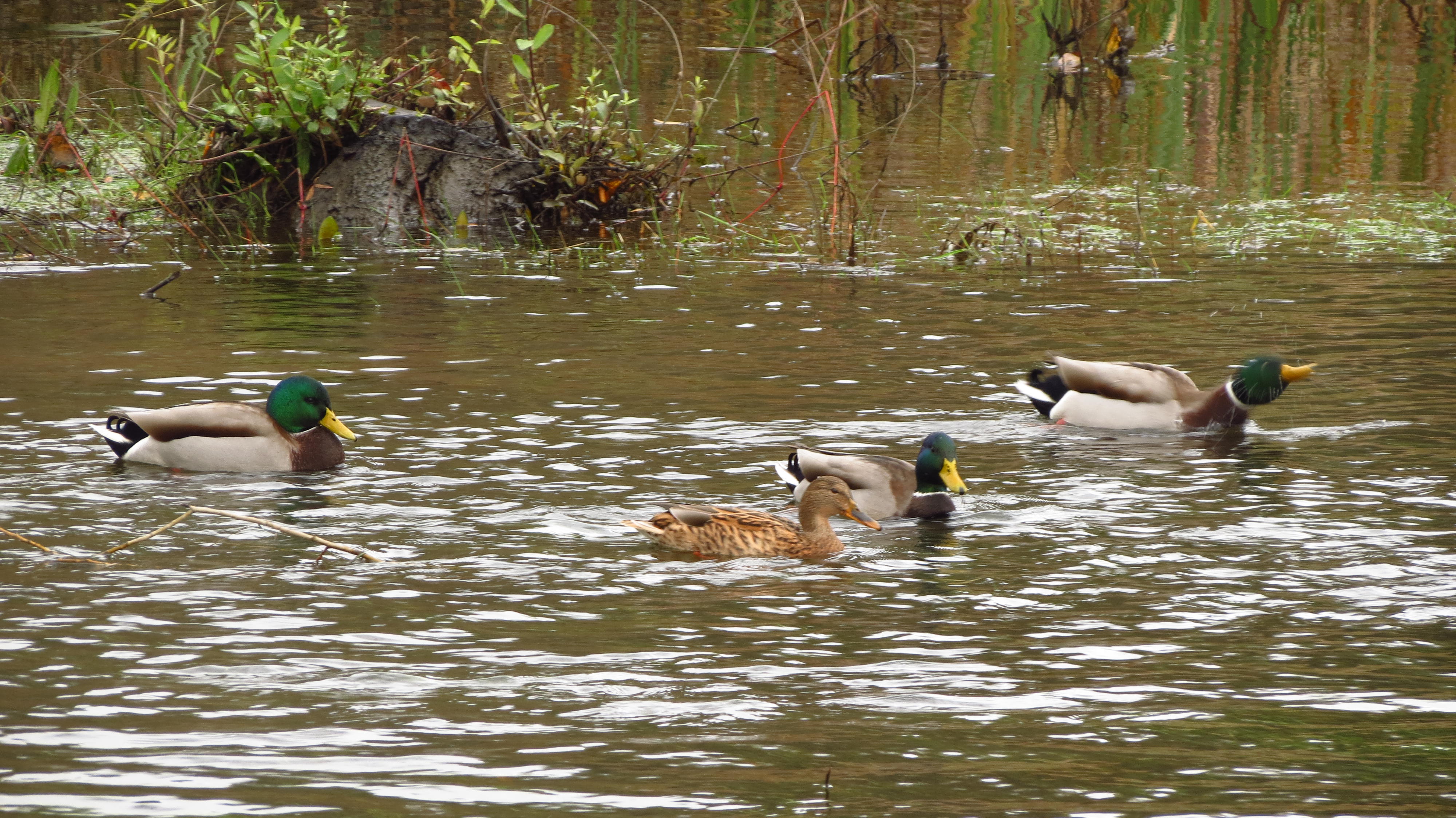 Fotografía de unos patos silvestres nadando y bañándose muy cerca del Puente Romano de Salamanca.