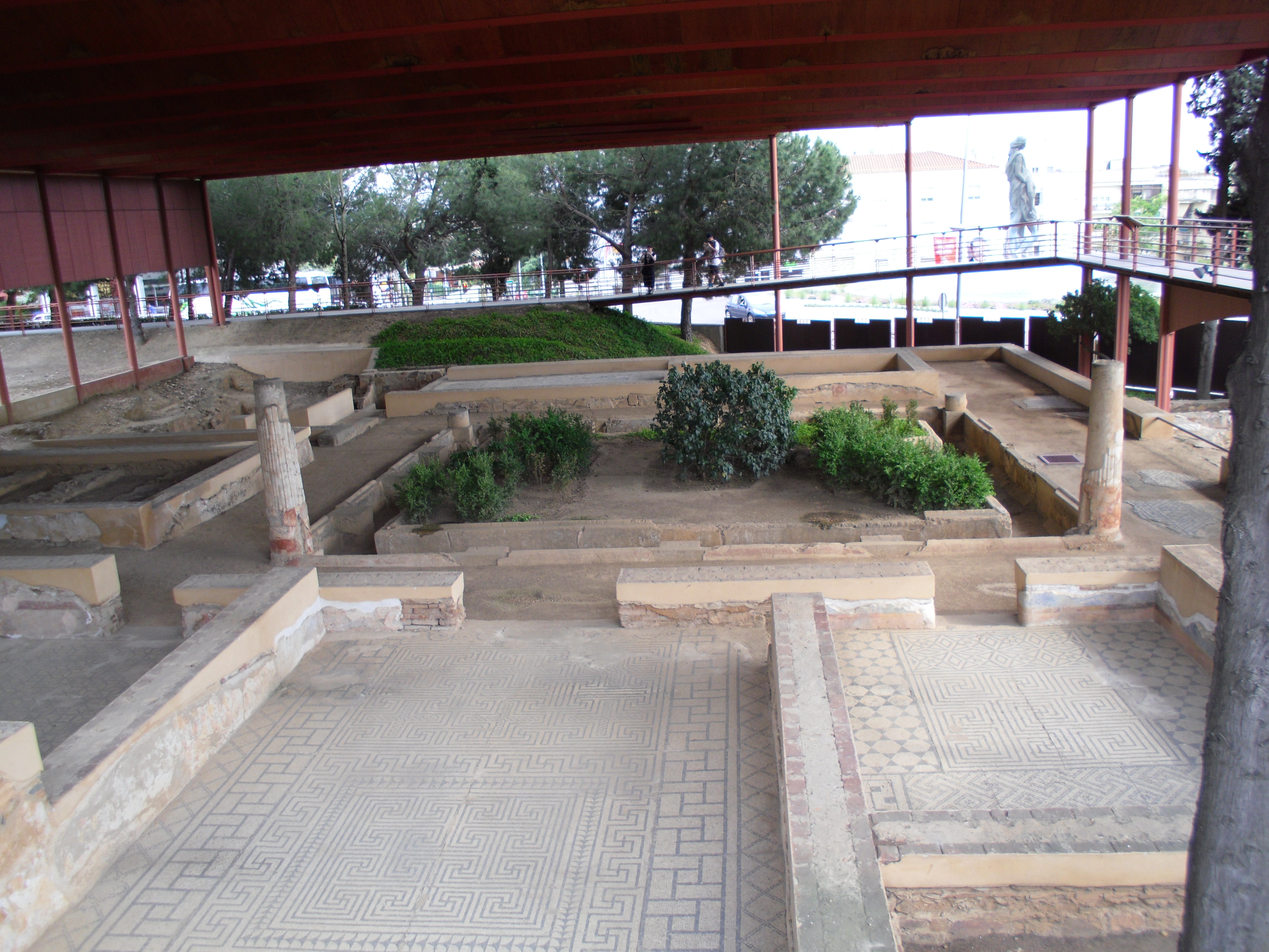 Restos del peristilo de una domus (casa) romana en Mérida, llamada domus del Mitreo por encontrarse cerca de los restos de un santuario a Mitra. Domus señorial que contaba con tres patios: dos atrios y un peristilo, en torno a los cuales se organizaban las estancias de la vivienda. Se aprecian en la foto los restos de las columnas de dicho patio
