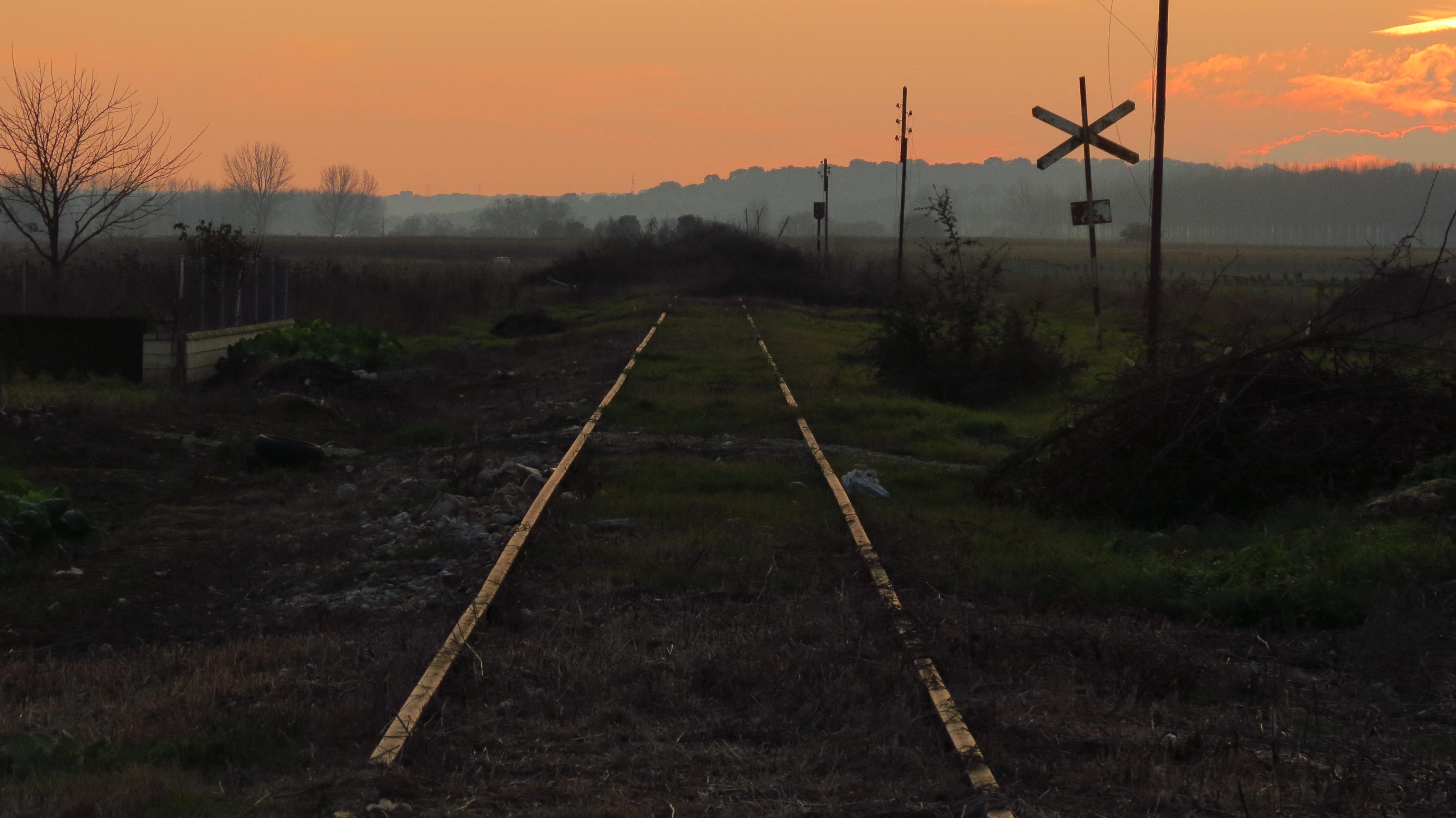 Viejas vias de ferrocarril abandonadas, al ocaso.