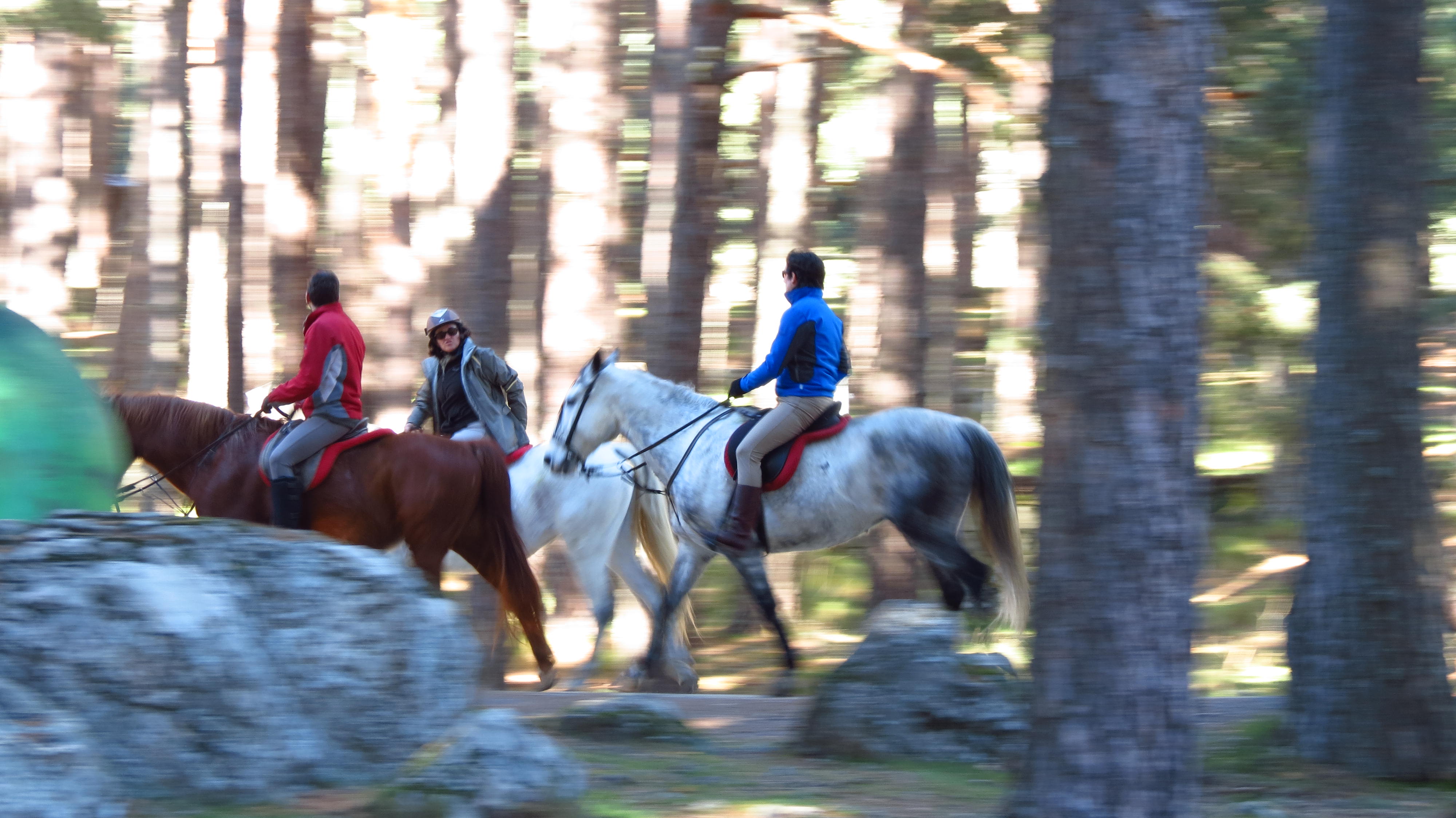 Jinetes entre los pinos con cierto efecto de perspectiva y movimiento ocasionado por la forma de tomar la foto en giro.