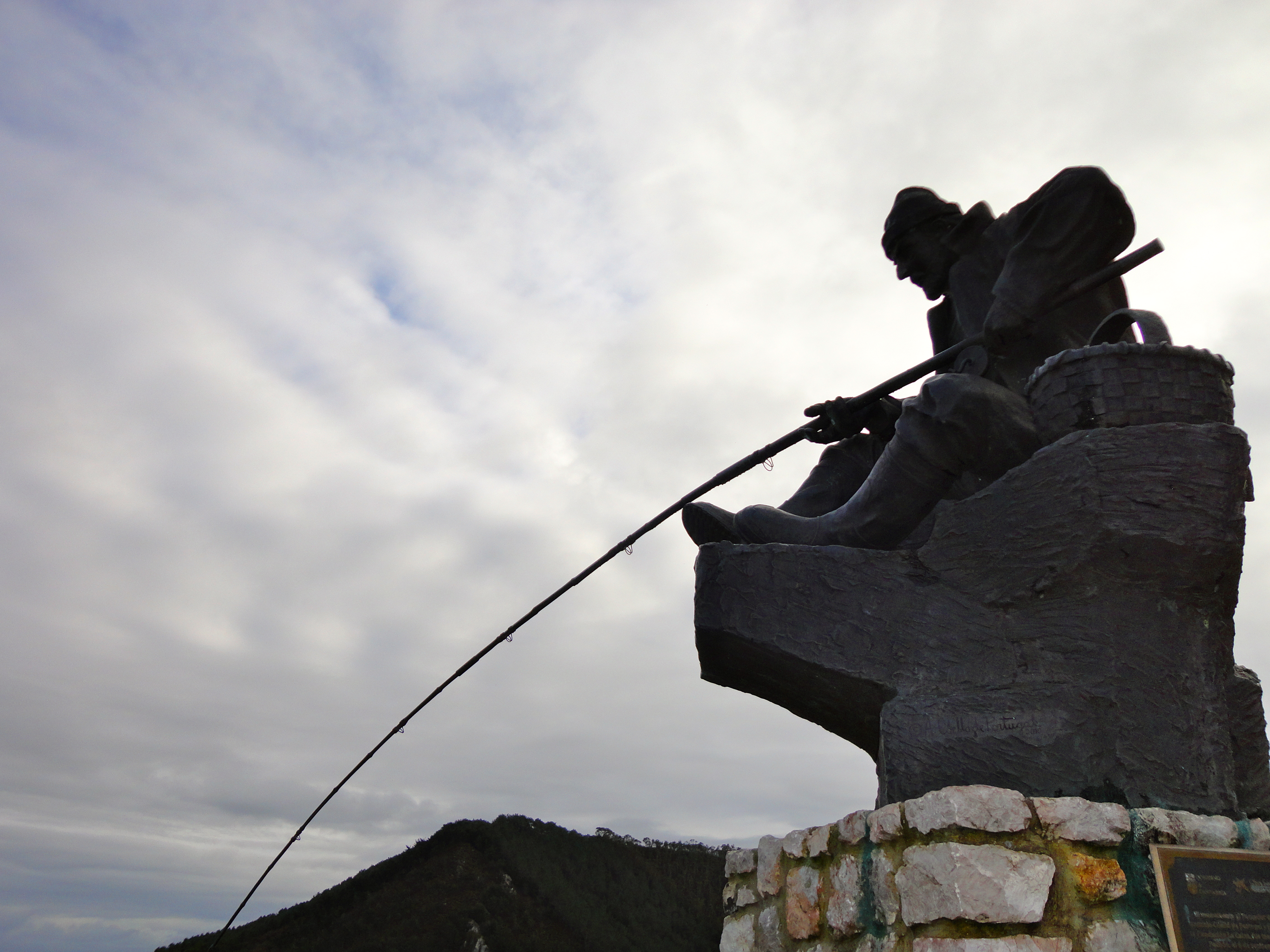 Vision lateral de la escultura de un pescador asturiano en el municipio de Pechón.