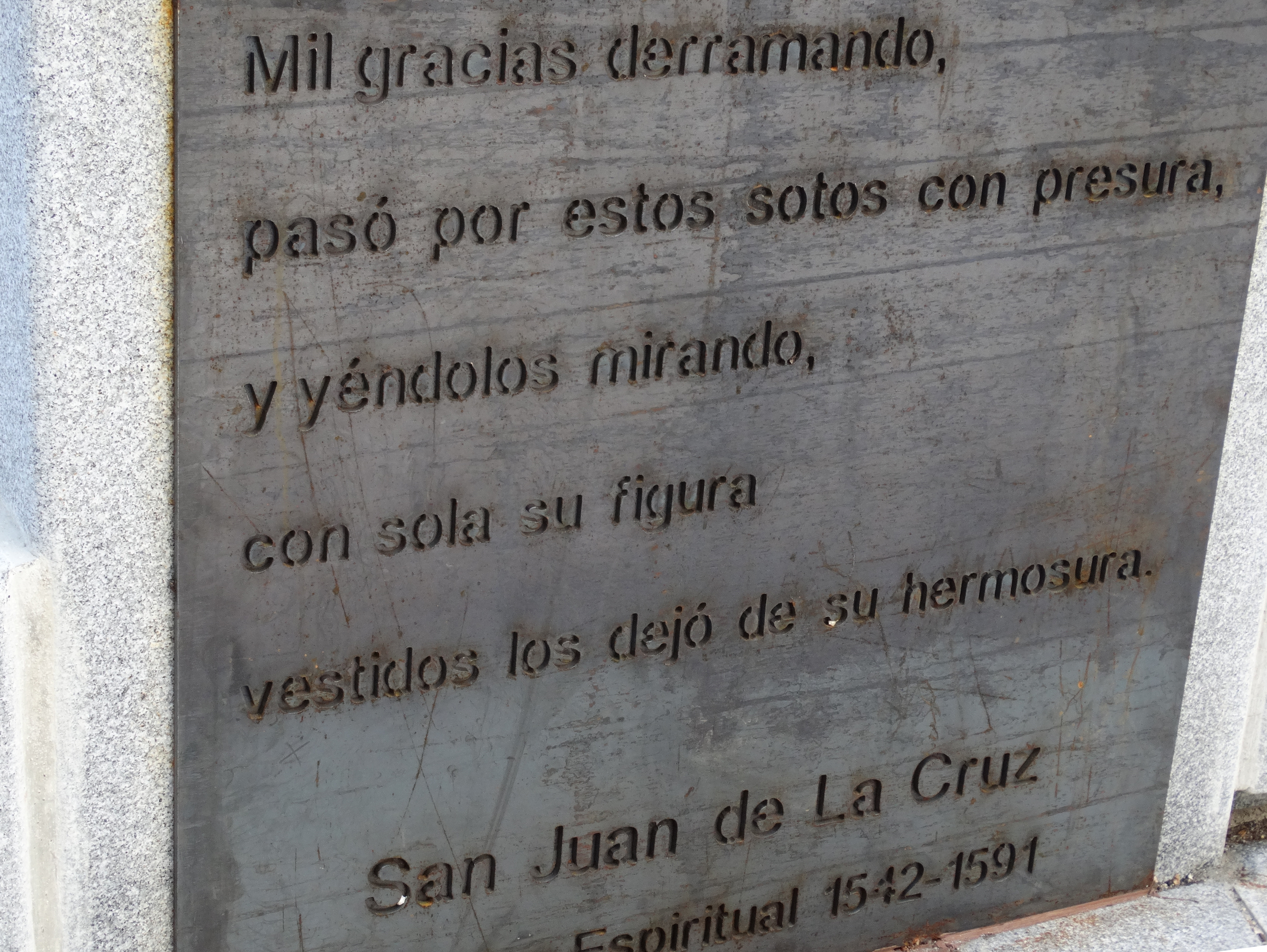 Fragmento del poema Cántico Espiritual de San Juan de la Cruz escrito al pie de su escultura.