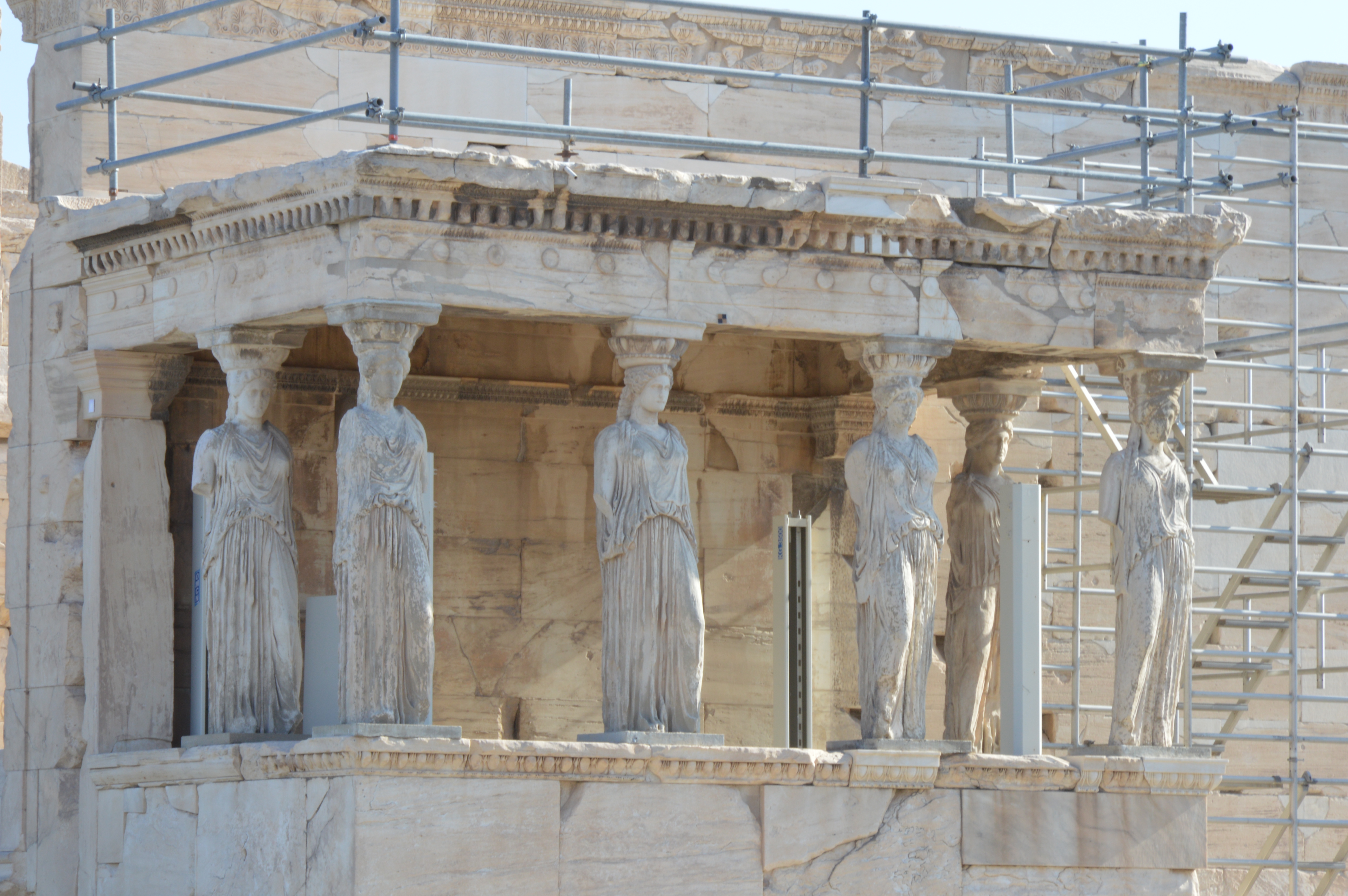 Pórtico de la parte sur del Erecteion (templo jónico de la Acrópolis de Atenas en honor a Atenea y Poseidón construido en época de Pericles, s. V a. C.). Las columas son figuras de muchachas al estilo de las Korai arcaicas.Su autor es Mnesikles. Las figuras originales se encuentran en el museo de la Acrópolis y representan a una mujer de pie con túnica