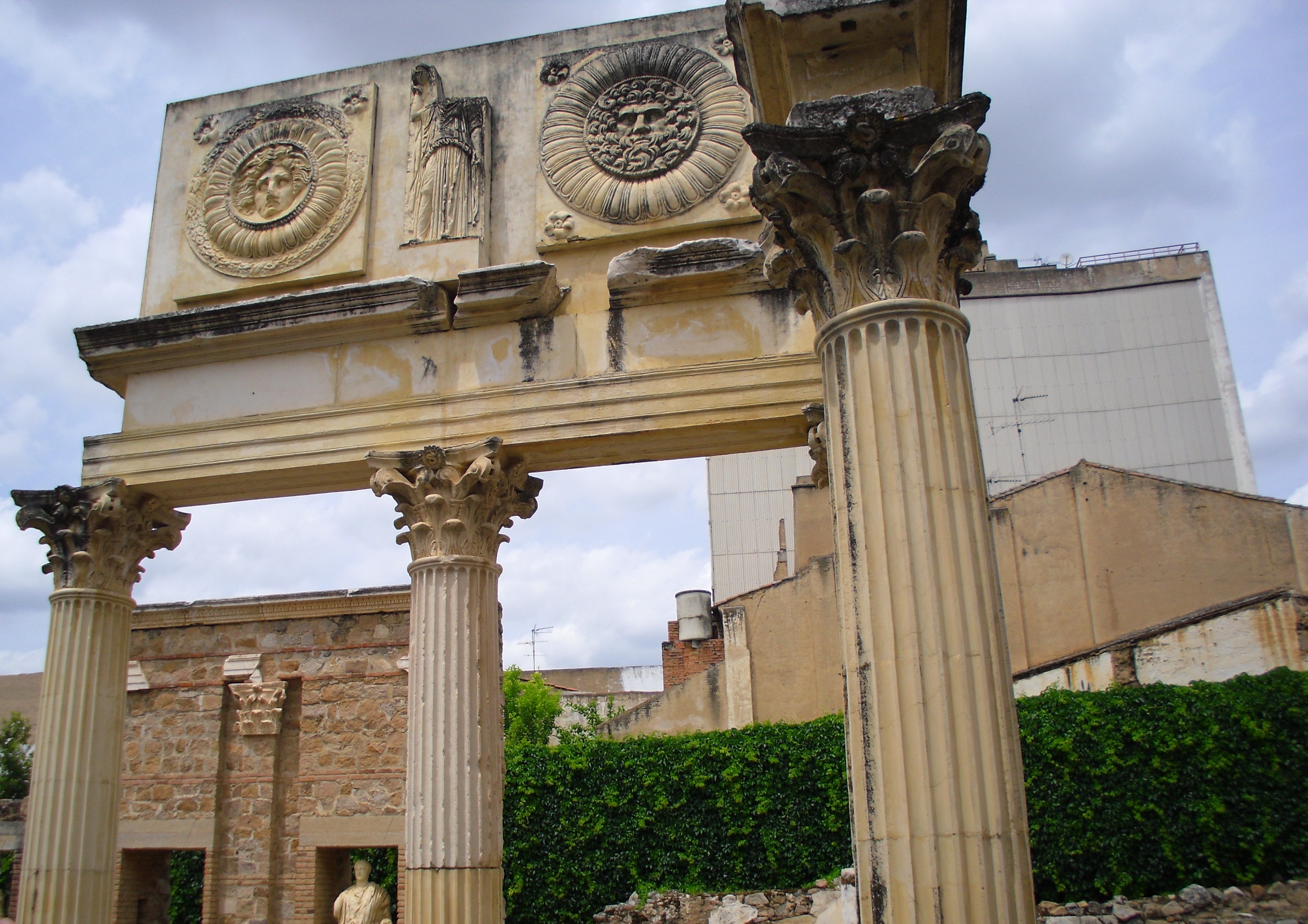 Este pórtico formaba parte de unos de los foros de Mérida. Por el hecho de ser Emerita Augusta capital de provincia, contaba con dos foros, un o municipal, para asuntos relativos a la ciudad de Mérida y otro provincial, para tratar temas de la provincia. El pórtico del foro municipal presenta columnas de estilo corintio y una decoración con esculturas y clípeos donde se representaban personajes mitológicos