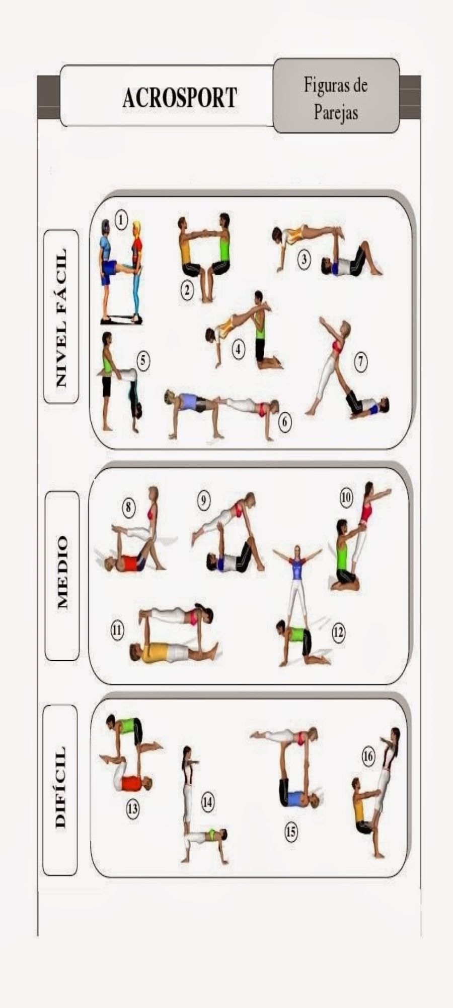 Presentación de diferentes posturas para la práctica de Acrosport por parejas. Documento generado en el GT "Nuevas estrategias lúdico-formativas en la Educación Física actual" del CEIP San Claudio de León.