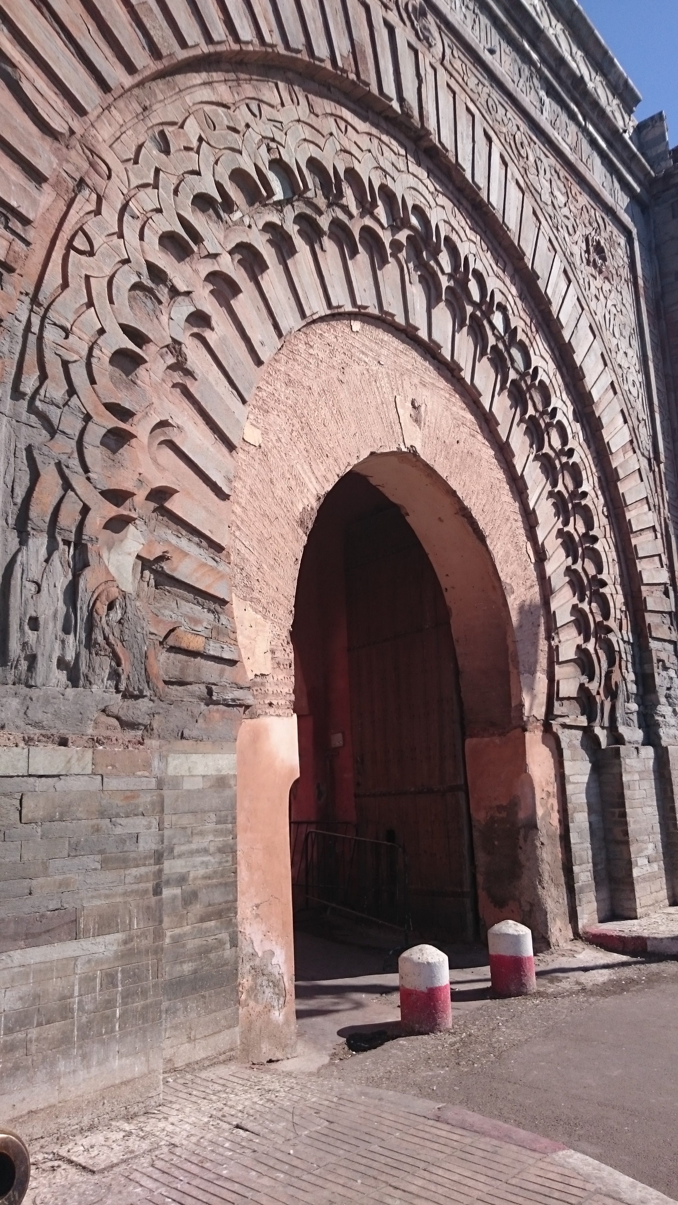 Puerta de acceso a la kasbah (barrio bullicioso y con numerosas tiendas y callejones) de la medina (fortificación) de Marrakech, Marruecos. Es del s. XII, de época almohade, con varios arcos de medio punto superpuestos y de variada decoración geométrica y floral, así como abundante colorido. En esta puerta se exponían las cabezas de los ajusticiados de la ciudad.