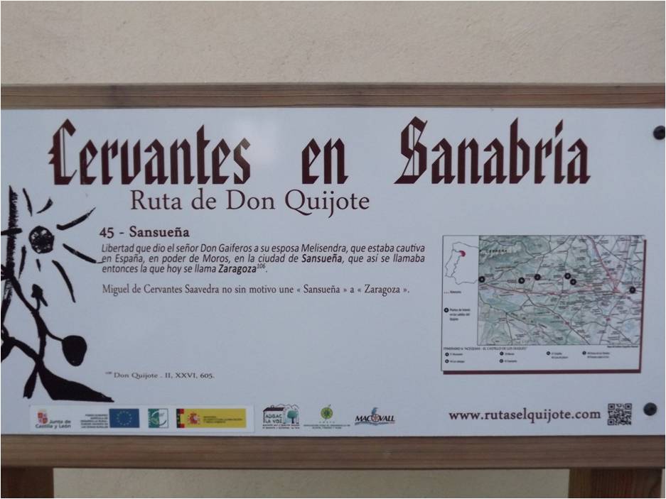 Placa de la ruta Cervantes en Sanabria. Incluye texto del Quijote sobre Sansueña, posible referencia a una ciudad romana próxima a Santibáñez
