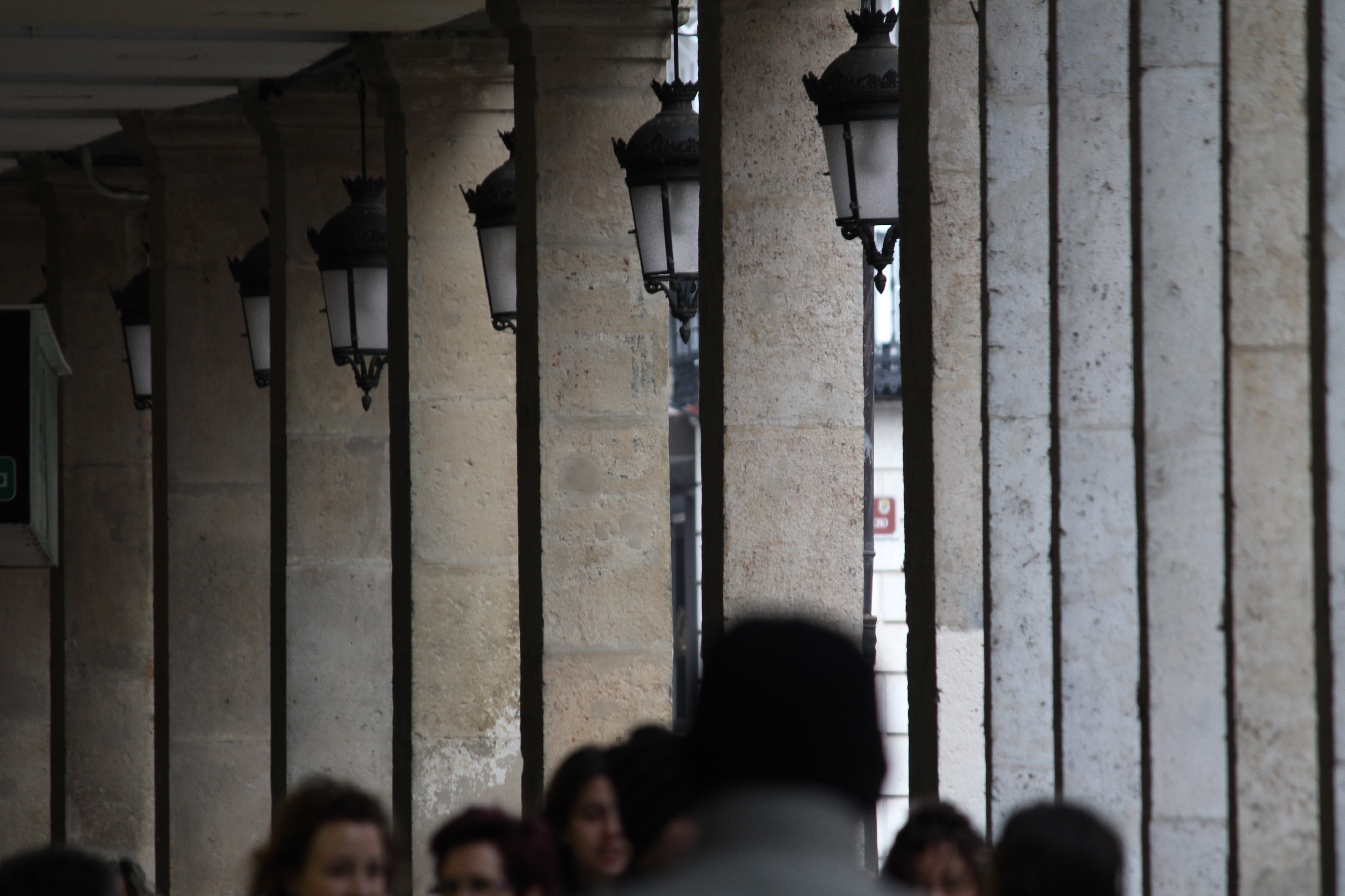 Gente paseando por los soportales de la Calle Mayor de Palencia.
