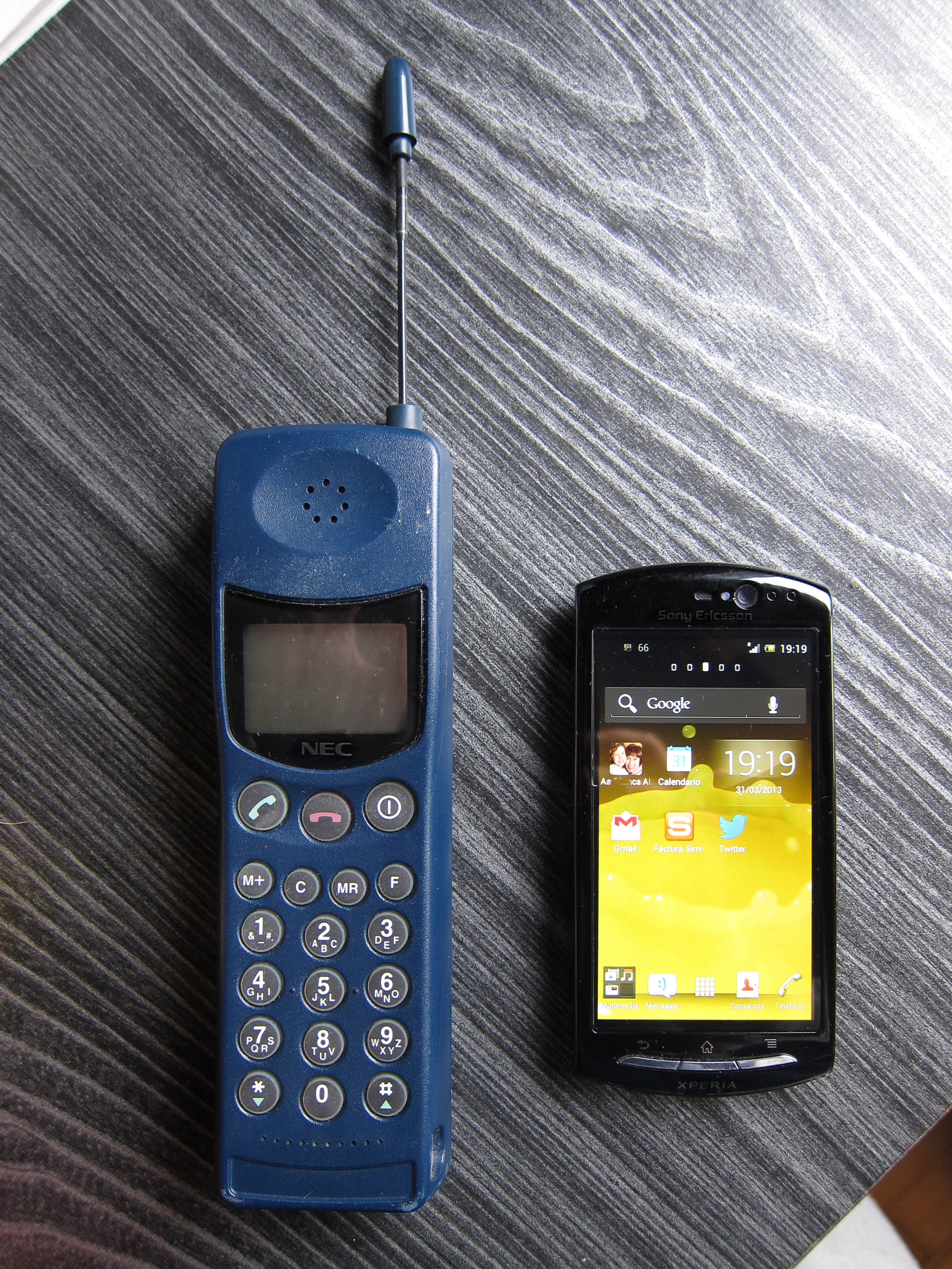 Imagen de dos teléfonos móviles. A la izquierda un TMA o teléfono móvil analógico de 1995, a la derecha un smartphone android GSM de 2012.