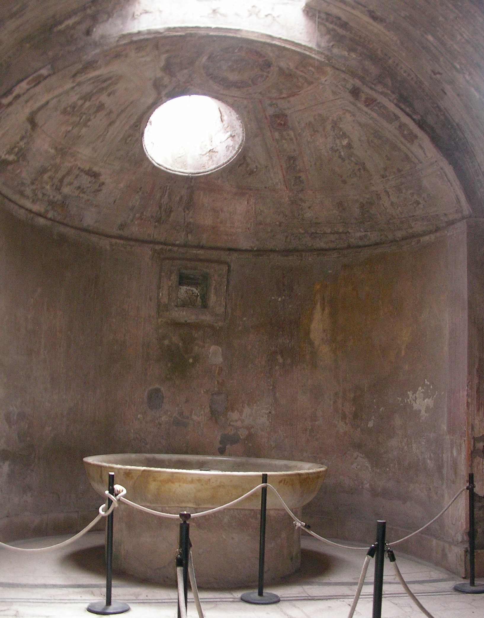 Restos de las termas del foro de Pompeya, sepultada bajo las cenizas tras la erupción del Vesubio en el 79. Las termas eran el lugar de esparcimiento de los ciudadanos romanos, donde se relajaban, hacían ejercicio o incluso trataban temas de negocios. Estas termas pompeyanas tenían salas separadas para hombres y mujeres además de una palestra para hacer ejercicio y el resto de salas características de las termas romanas: vestuario (apodyterium), salas de agua fría (frigidarium), templada (tepidarium) y caliente (caldarium).