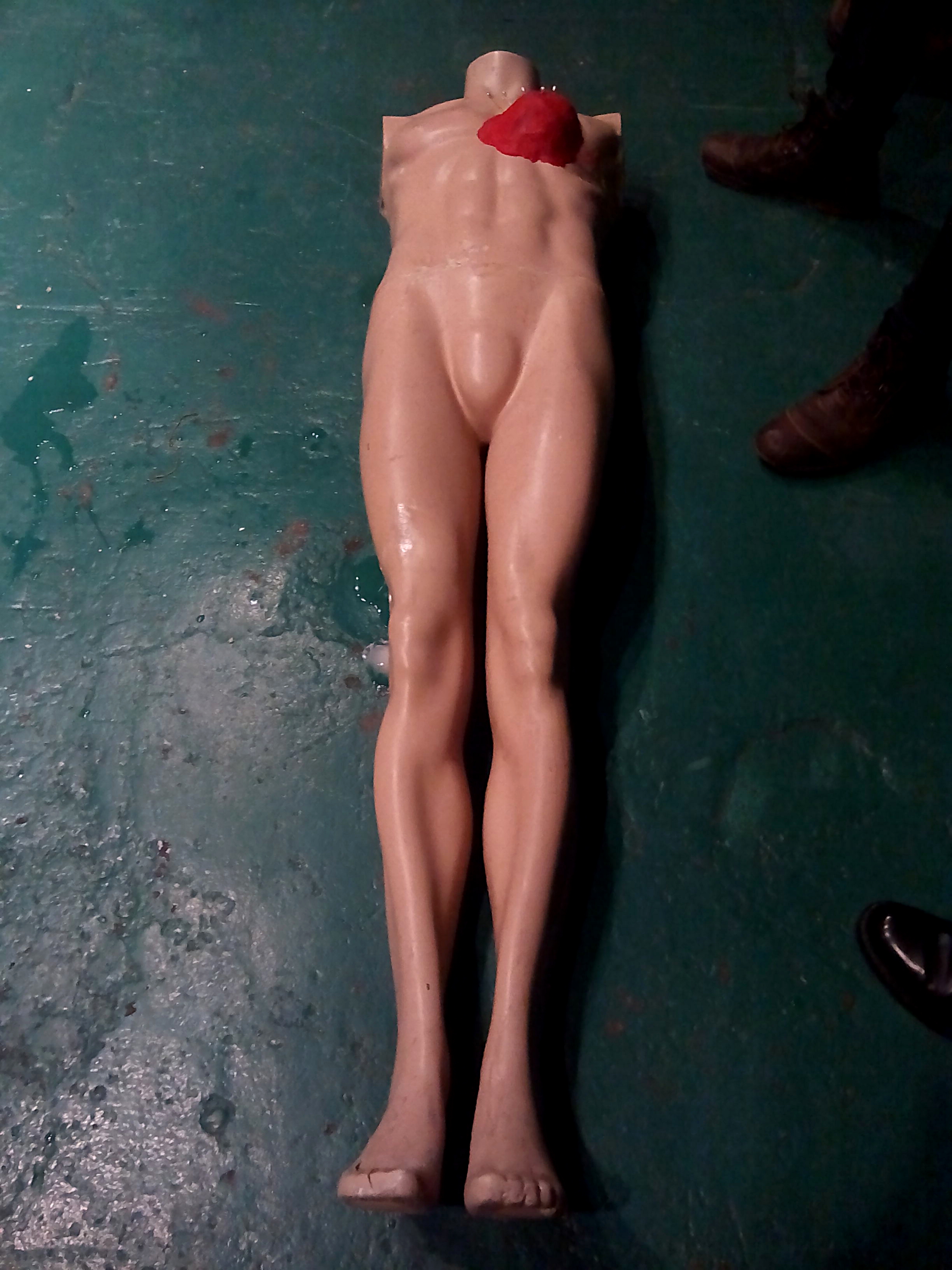 Momento del espectáculo teatral "Una Flor en la Nevera, Ritual de descongelación" de la compañía Pez Luna Teatro, protagonizado por Mercedes Herrero. Dar voz a un cuerpo invadido. Sala Encoarte, (Palencia, España. noviembre 2014)