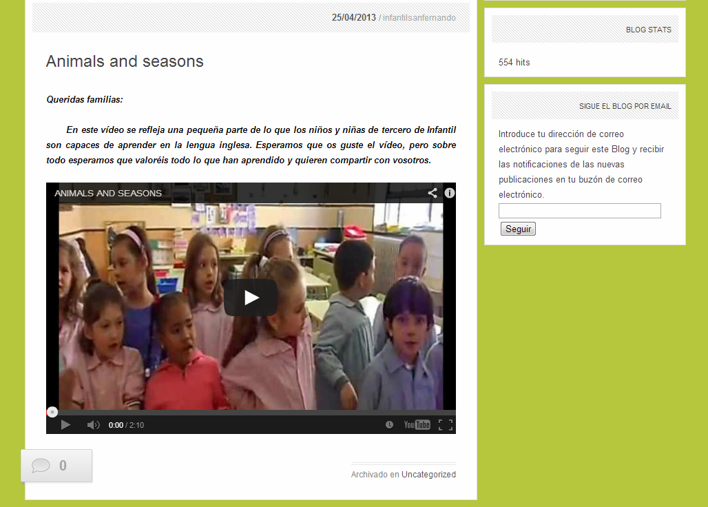 Blog que recoge el trabajo realizado en el Proyecto de Innovación El Rincón de Inglés. Dicho proyecto se ha puesto en marcha con la metodología de rincones; el blog sirve tanto para difundir las experiencias del aula, como para comunicarse con las familias y recomendarles recursos con los que trabajar en el hogar.
