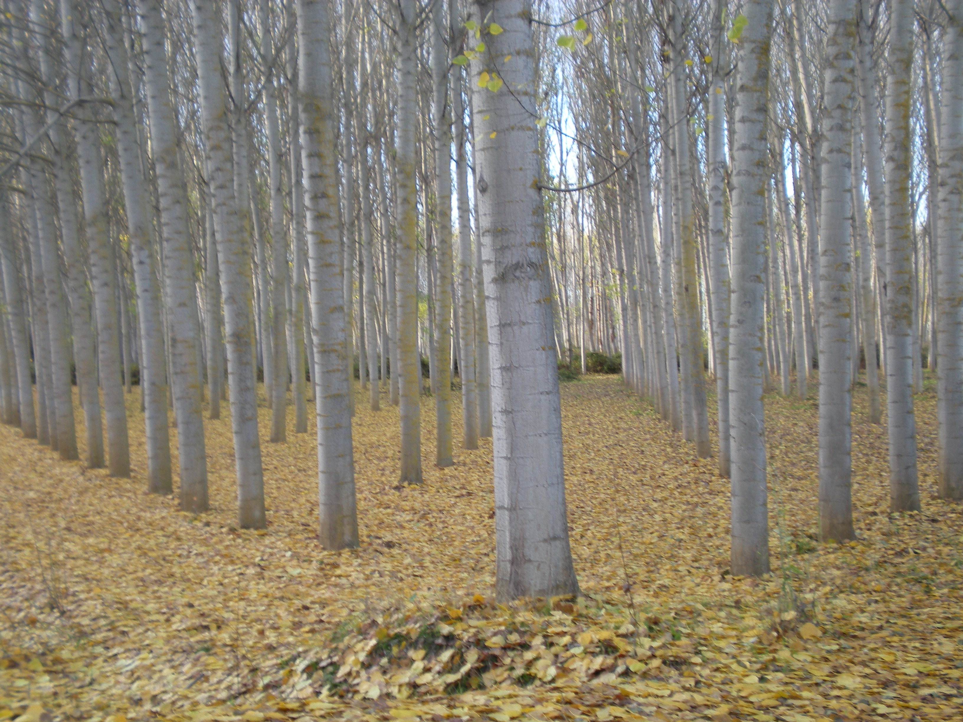 Fotografía de paisaje otoñal. Plantación de chopos en otoño.