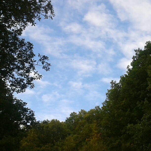 Fotografía del cielo con algunas nubes, enmarcado entre árboles