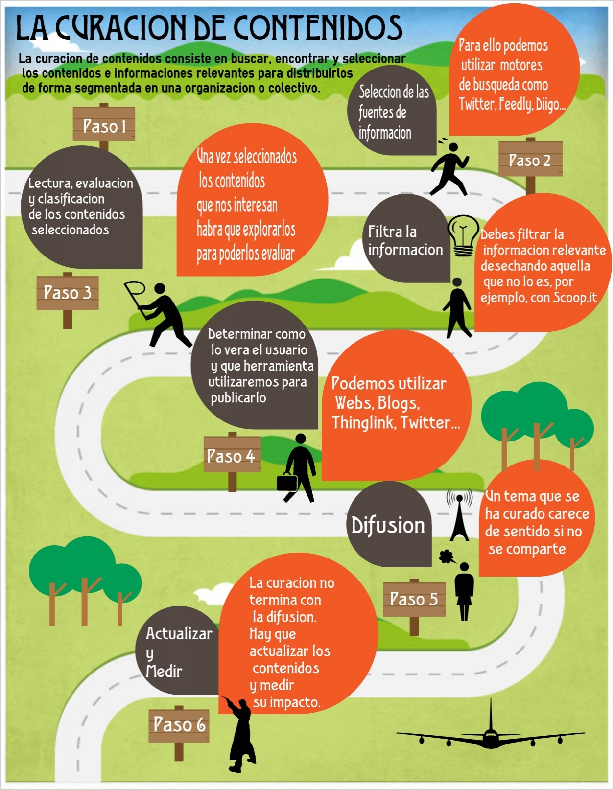 Infografía sobre la curación de contenidos, lo cual consiste en buscar, encontrar y seleccionar las informaciones relevantes antes de compartirlas. Se trata de un método de trabajo que debemos ir introduciendo en el aula para enseñar al alumnado a trabajar contra el exceso de información en Internet.