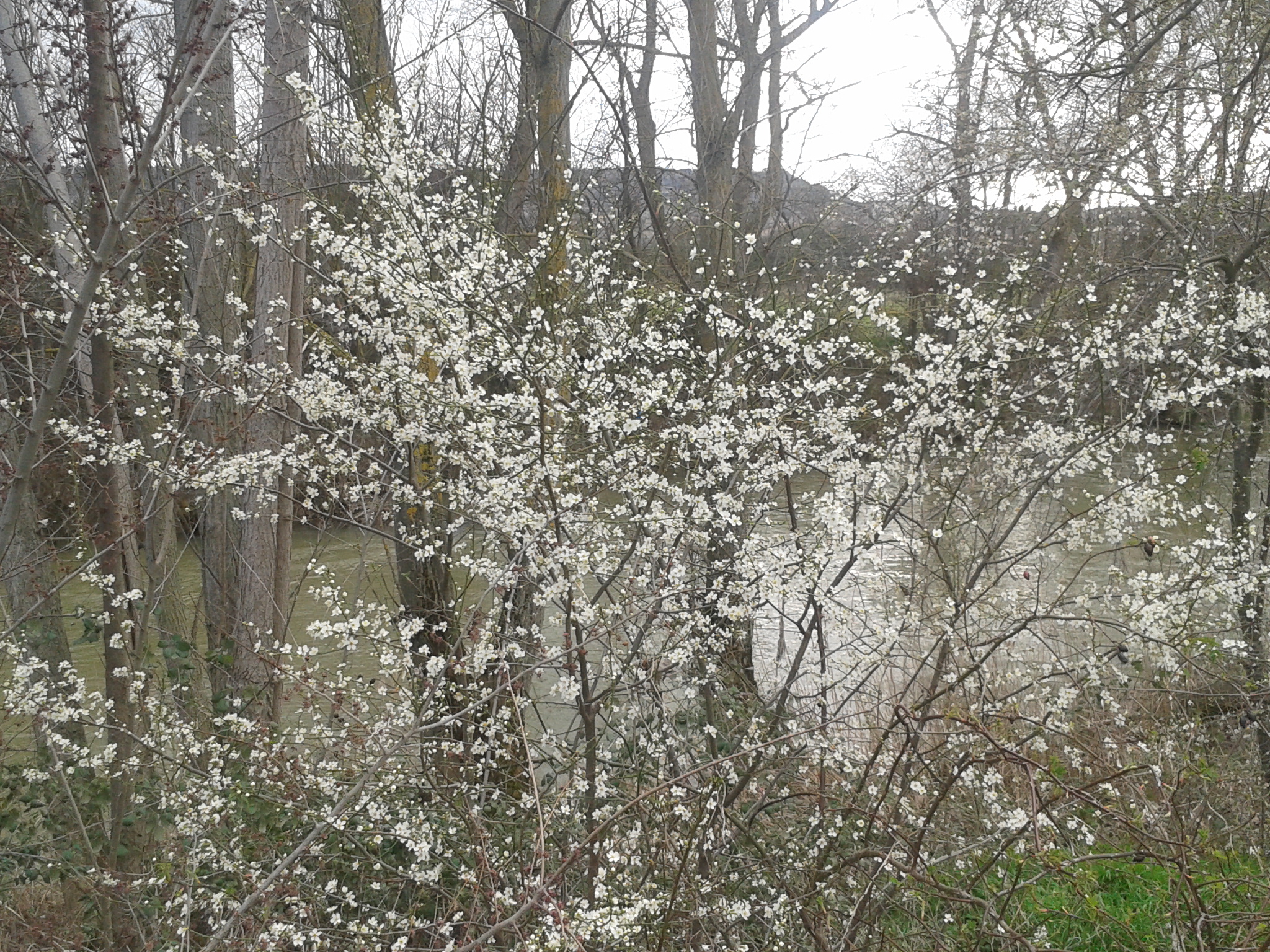 Fotografía de flores blancas junto a la ribera de un río en primavera
