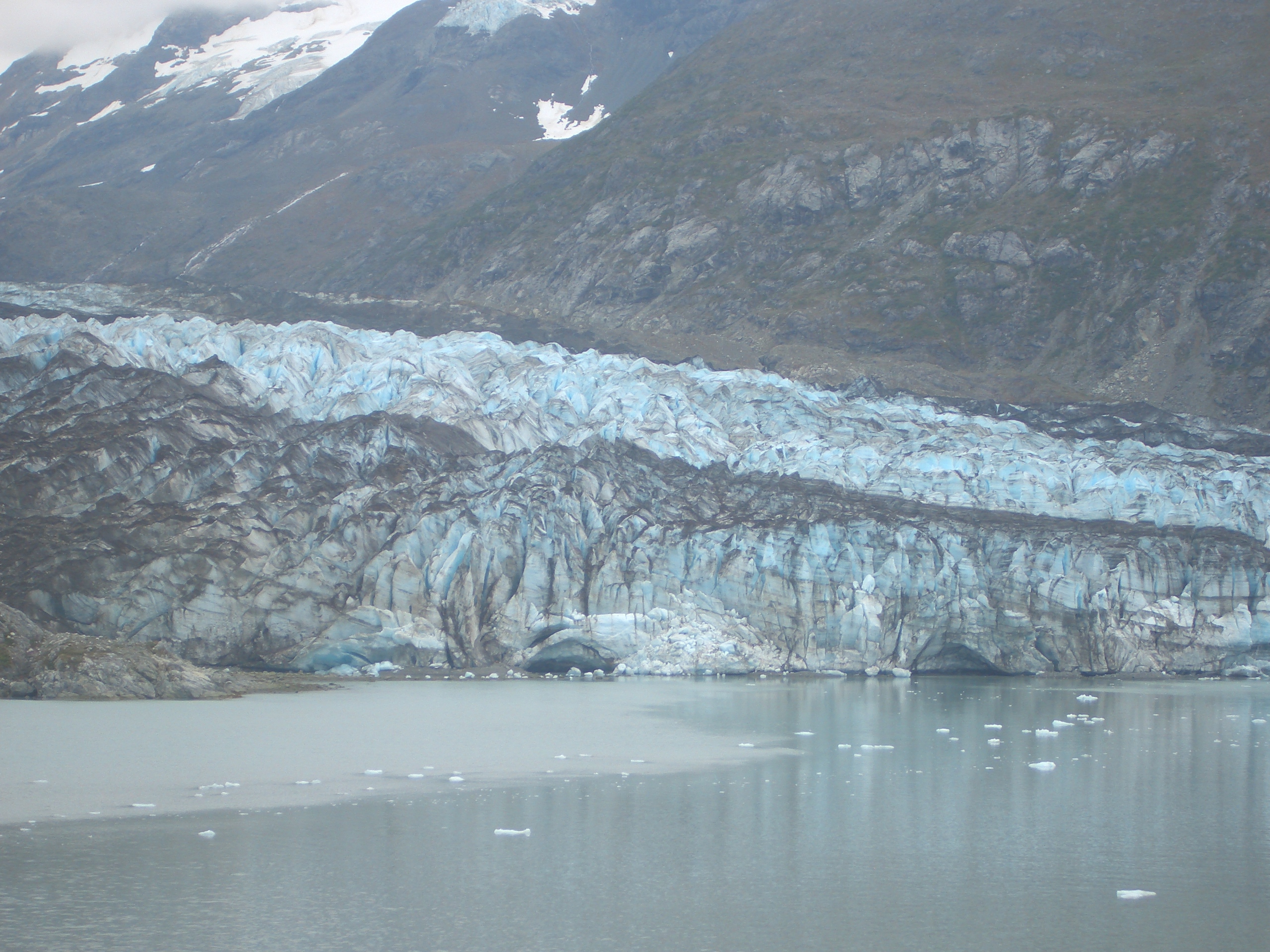 Muestra la lengua de un glaciar en su fase final de fusión bordeada en su camino por la morrena lateral que llega a invadir el hielo superficial de la lengua