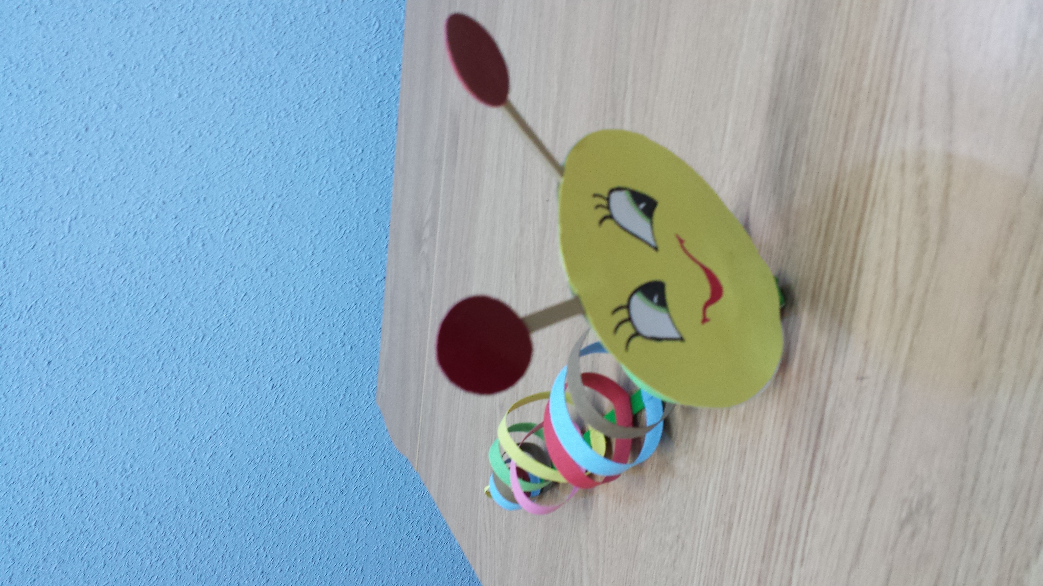 Muestra un ejemplo de como con cartulina, pegamento y unas tijeras se pueden crear un animal, en este caso un gusano.