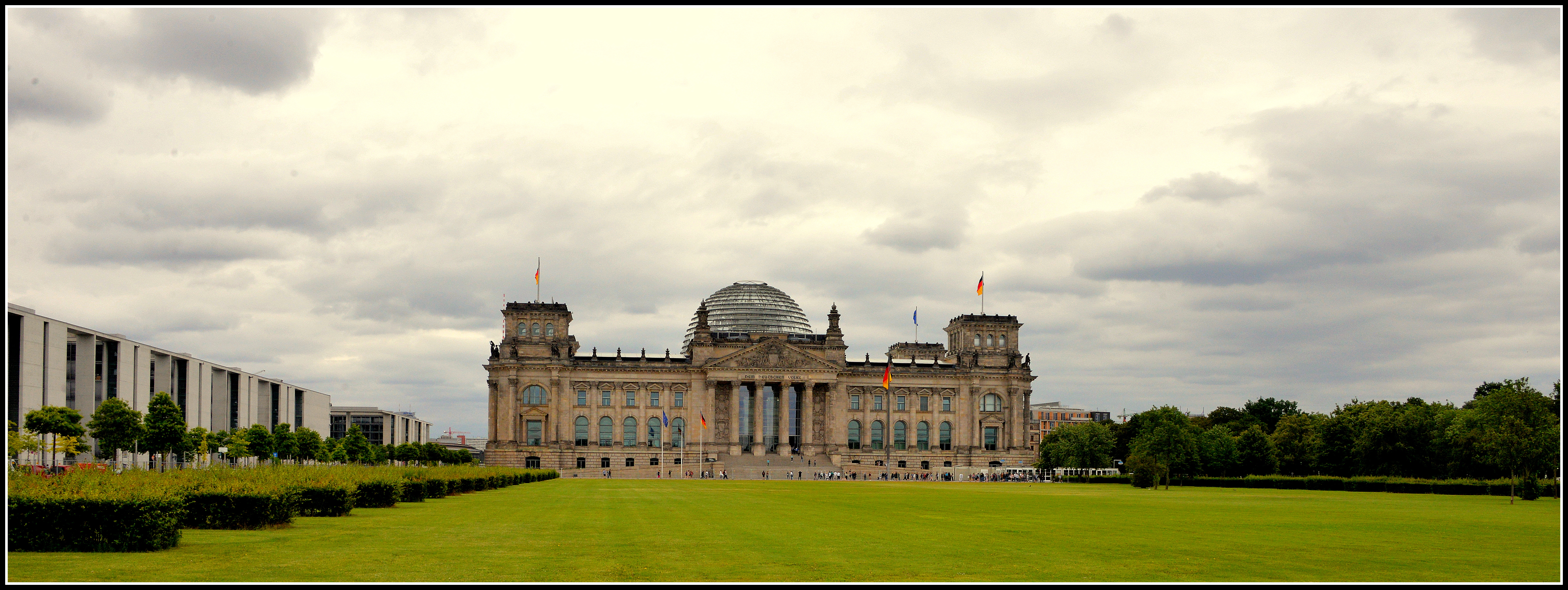 Imagen panorámica del antiguo edificio del Reichtag y actual sede del Bundestag con la cúpula diseñada por el arquitecto británico Norman Foster.