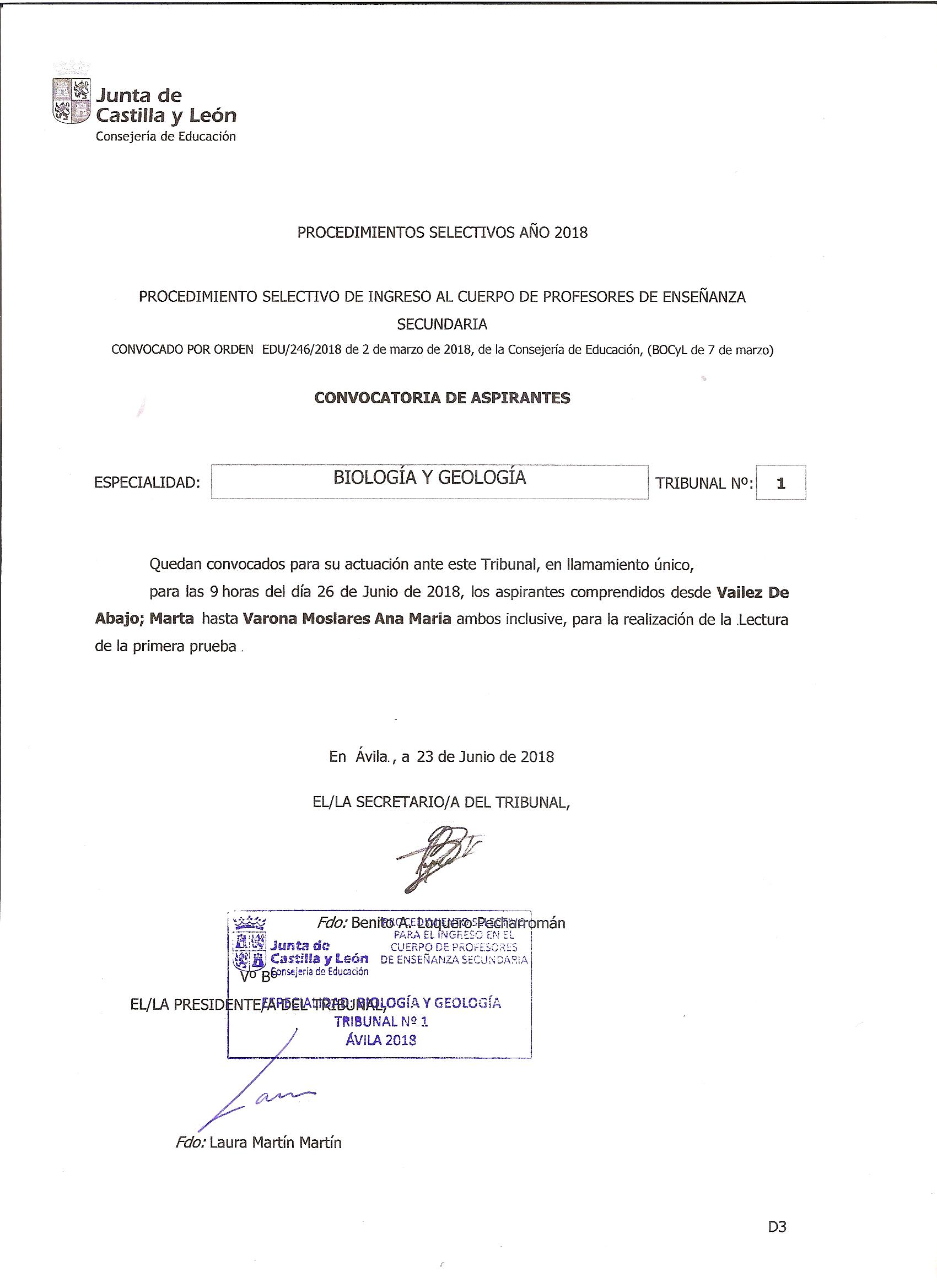 Llamamiento para realizar la lectura de la primera pueba para el día 27 de junio de 2018